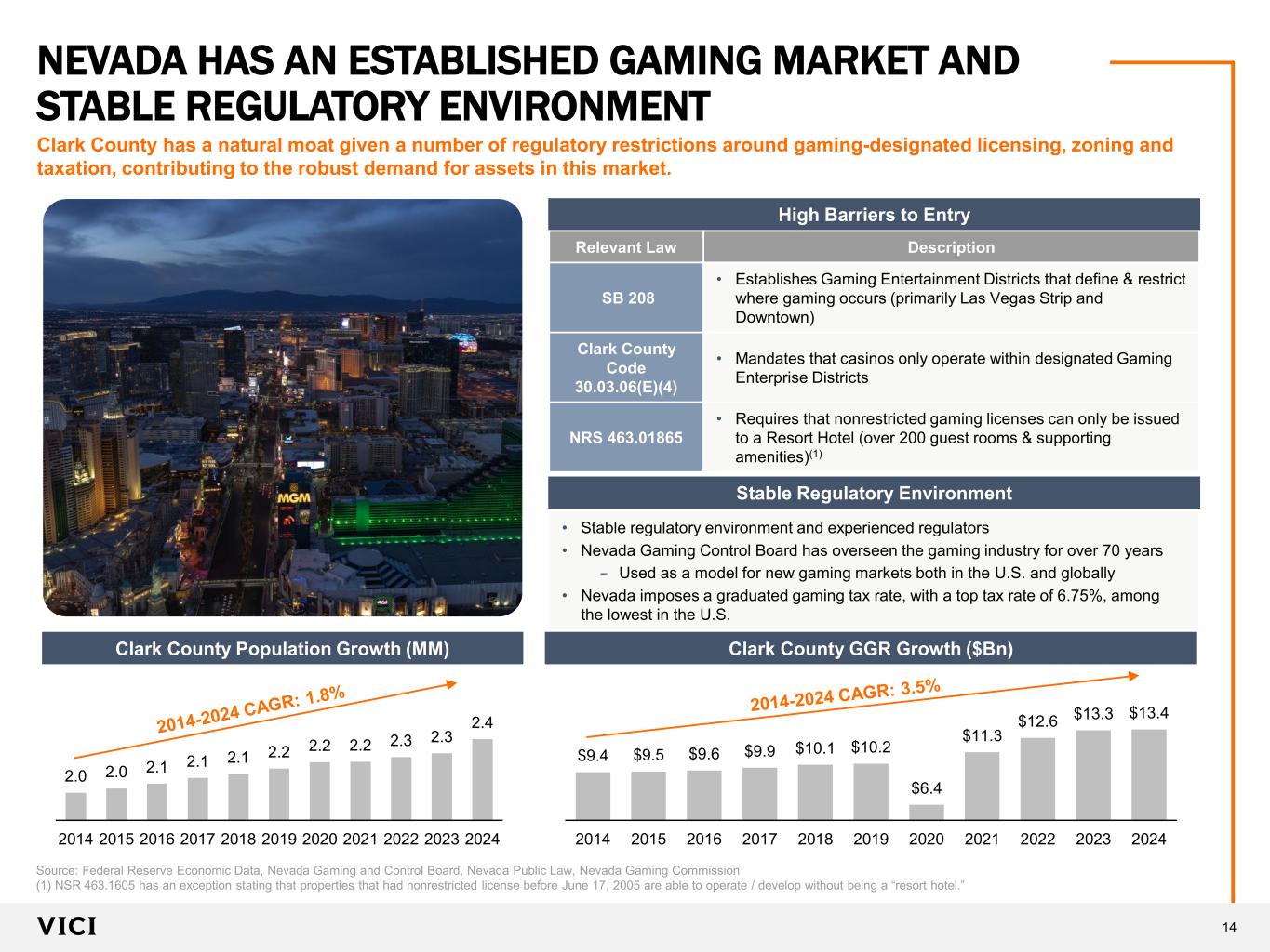 13 EXPOSURE TO ATTRACTIVE LAS VEGAS LOCALS MARKET Source: Federal Reserve Economic Data, Nevada Gaming Control Board as of September 2025 The Las Vegas Locals market is the 2nd largest U.S. gaming market by Gross Gaming Revenue (“GGR”). $8.8 $3.2 $2.8 $2.2 $2.1 $1.6 $1.6 $1.3 $1.3 $1.1 Las Vegas Strip Las Vegas Locals Atlantic City Chicagoland Baltimore-Washington DC Queens/Yonkers Gulf Coast Philadelphia Detroit St. Louis 2024 GGR by Market ($Bn) Las Vegas Locals GGR Growth ($Bn) $2.1 $2.1 $2.2 $2.3 $2.4 $2.4 $1.9 $2.9 $2.9 $3.0 $3.2 2014 2015 2016 2017 2018 2019 2020 2021 2022 2023 2024 Las Vegas Locals Median HHI ($000s) & Population Growth (MM) 0 1 2 3 $0 $25 $50 $75 $100 2014 2015 2016 2017 2018 2019 2020 2021 2022 2023 2024 P o p u la ti o n G ro w th ( M M ) M e d ia n H H I ($ 0 0 0 s ) Median HHI ($000s) Population Growth (MM) CAGR: 5.5% CAGR: 1.6% • The Las Vegas Locals market is one of the largest markets in the U.S. gaming landscape, supported by: – Consistent and stable growth – Strong demographic trends – High barriers to entry • The Locals market has experienced resilient and steady growth over the last decade, with a swift rebound following COVID • In the broader Las Vegas area, median household income has grown faster than the population, indicating an increasing pool of discretionary income that is potentially allocable to gaming spend • The market enjoys structural high barriers to entry due to Nevada law as well as an established and stable regulatory environment Key Market Dynamics