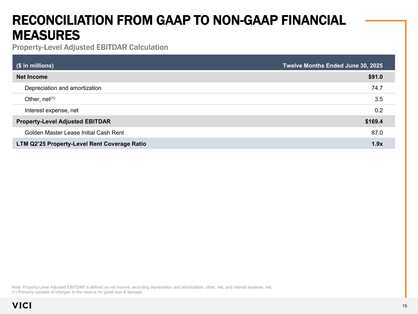 •Tenant Diversification: Upon closing, Golden OpCo will become VICI’s 5th largest tenant by annualized cash rent and 15th tenant overall (pro forma for the acquisition of the operations of MGM Northfield Park by an affiliate of Clairvest Group, Inc., which will become VICI’s 14th tenant upon closing of that transaction). VICI continues to focus on diversifying its tenant base with quality, long-term partnerships.