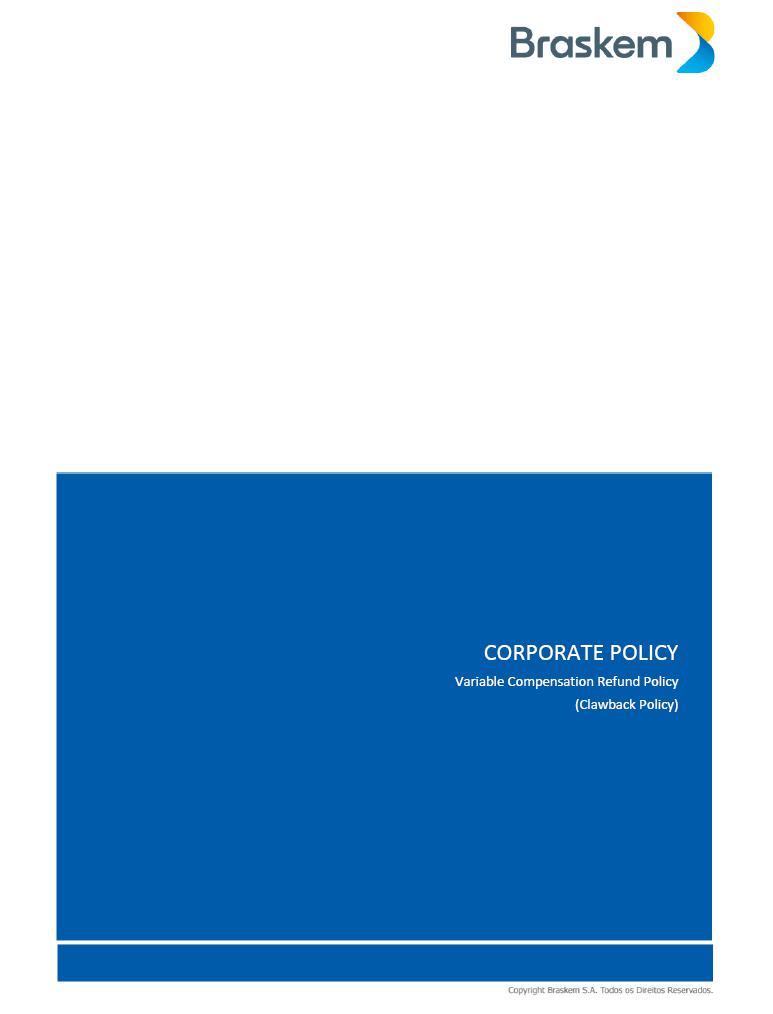 This Clawback Policy (“Policy”) establishes the principles and mechanisms for the restitution of certain amounts of Variable Compensation paid by Braskem S/A (“Braskem” or “Company”) to the Executive Officers based on the Company’s Financial Statements that may subsequently be subject to Rectification.