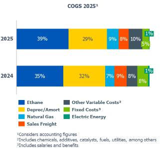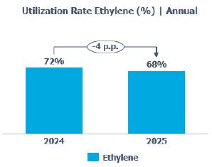 Braskem Idesa's operational performance was mainly impacted by the first general maintenance shutdown at the petrochemical complex since its construction. The maintenance operation involved approximately 3,000 people each day, all working under the most stringent safety protocols. The completion of the shutdown in 3Q25 coincided with the beginning of the ramp-up of the Puerto Mexico Chemical Terminal (“TQPM”), which was inaugurated in May 2025 and began supplying ethane, still during its commissioning phase, to Braskem Idesa in September 2025. The ethane supplied through TQPM, in addition to reducing costs associated with importing ethane through the Fast Track solution, allows Braskem Idesa to operate at a higher and more consistent utilization rate, since fluctuations in ethane supply by PEMEX impact Braskem Idesa's operations. In 2025, the average volume of ethane supplied by PEMEX was 17.1 thousand barrels per day, which is lower than the 28.9 thousand barrels per day supplied in 2024 and also below the minimum contractual volume of 30 thousand barrels per day. The volume of imported ethane totaled approximately 24.2 thousand barrels per day, considering the 8.3 thousand barrels per day (on an annual average) supplied by TQPM.