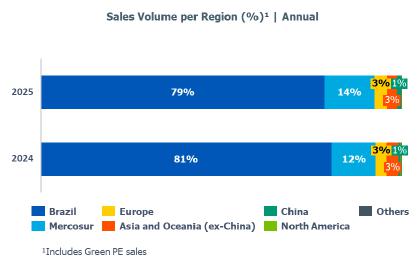In the global petrochemical scenario, in 2025, the level of spreads remained pressured, mainly due to the continuous entry of new PE and PP capacities throughout the year and the uncertainties regarding trade tensions between the United States and China. In addition, oil prices were mainly impacted by the economic uncertainty generated by the tariff war, in addition to the gradual resumption of production by OPEC+, which contributed to adjustments in global supply, which pressured resin price references in the international market.