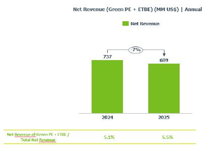 | (iii) | Migration to products with renewable sources: aims to expand its production capacity to 1 million tons per year by 2030. Among the initiatives in progress, the following stand out: (i) the Sustainea joint venture, in partnership with Sojitz, which is studying the construction of plants for the production of MEG (monoethylene glycol) from renewable sources ("bioMEG") and MPG (monopropylene glycol) from renewable sources ("bioMPG"), currently in the scope and engineering development phase; (ii) the joint venture Braskem Siam, in partnership with SCG Chemicals, which evaluates the construction of the first green ethylene plant outside Brazil, in Thailand. The project advanced in 2025 in the engineering detailing phase, in addition to advances related to ethanol supply agreements with local players. |