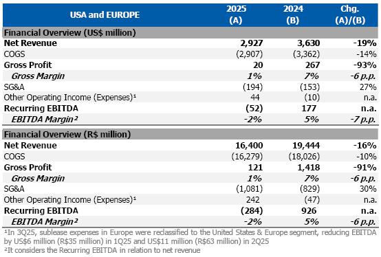 In this scenario, Braskem reported Recurring EBITDA of US$557 million (R$3.2 billion) in 2025, lower in U.S. dollar (-49%) and in Brazilian real (-45%) compared to 2024, mainly due to a 77% reduction in gross profit, associated with lower spreads of main chemicals and resins in all of the Company's reportable segments, combined with lower sales volume in the Brazil/South America, and Mexico segments.