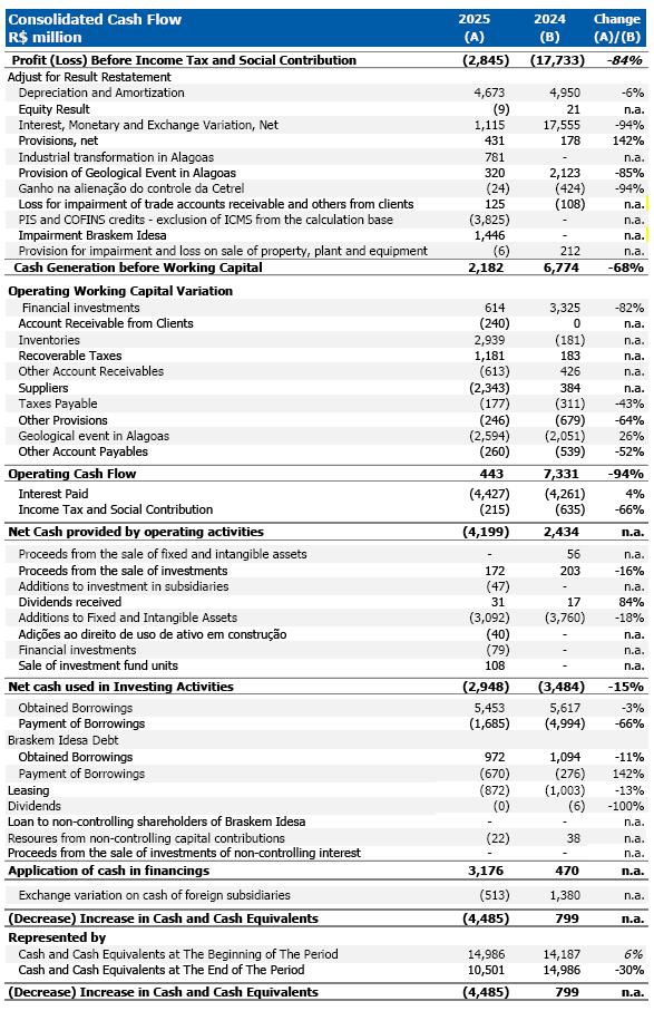 The Company's pre-debt cash consumption was R$7.3 billion, representing a 116% increase over the R$3.4 billion reported in 2024. This was primarily driven by a R$3.4 billion decrease in Recurring EBITDA during the year, as previously mentioned, and a R$3.0 billion increase in working capital consumption, mainly due to reduced availability of certain payment arrangements with financial institutions and suppliers. Additionally, in October 2025, Braskem drew down the available stand-by facility in the amount of US$1.0 billion to strengthen its liquidity in the face of the industry’s prolonged downturn cycle, in line with the Company’s conservative cash management. Thus, at the end of 2025, the Company's cash position totaled US$2.1 billion (R$11.5 billion).