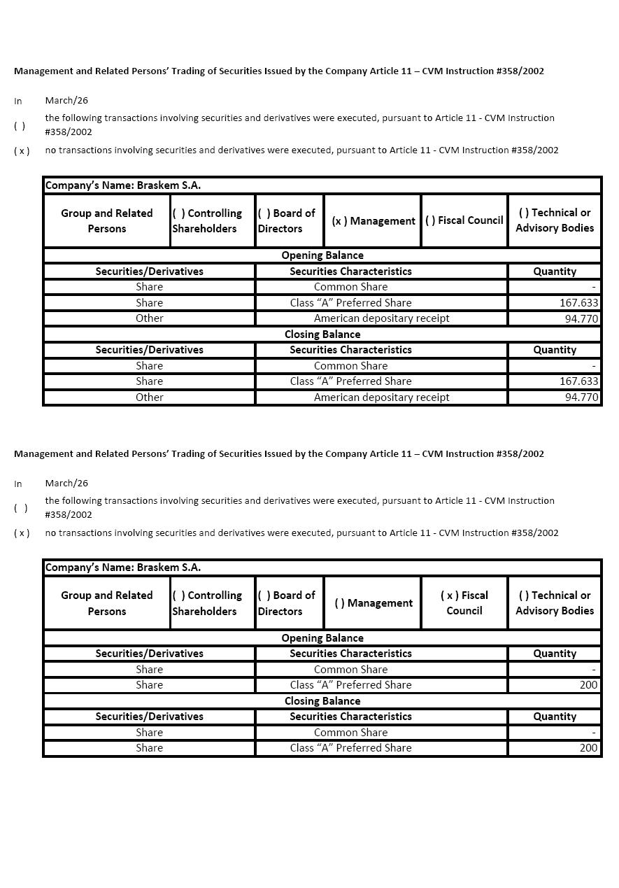 In March/26 ( ) ( x ) Group and Related Persons ( x ) Controlling Shareholders ( ) Board of Directors ( ) Management In March/26 ( ) ( x ) Group and Related Persons ( ) Controlling Shareholders ( x ) Board of Directors ( ) Management Securities/Derivatives Securities Characteristics Share Securities/Derivatives Securities Characteristics Share Class “A” Preferred Share Share Common Share Share Class “A” Preferred Share Securities Characteristics Securities/Derivatives Share Common Share ( ) Fiscal Council Common Share Share Class “A” Preferred Share Opening Balance 226.334.623 79.182.498 Quantity Management and Related Persons’ Trading of Securities Issued by the Company Article 11 – CVM Instruction #358/2002 79.182.498 Quantity Common Share Securities/Derivatives Securities Characteristics CONSOLIDATED FORM Share Share ( ) Fiscal Council Class “A” Preferred Share the following transactions involving securities and derivatives were executed, pursuant to Article 11 - CVM Instruction #358/2002 no transactions involving securities and derivatives were executed, pursuant to Article 11 - CVM Instruction #358/2002 ( ) Technical or Advisory Bodies Opening Balance Management and Related Persons’ Trading of Securities Issued by the Company Article 11 – CVM Instruction #358/2002 - 500 the following transactions involving securities and derivatives were executed, pursuant to Article 11 - CVM Instruction #358/2002 no transactions involving securities and derivatives were executed, pursuant to Article 11 - CVM Instruction #358/2002 Quantity - 500 Closing Balance Quantity Company’s Name: Braskem S.A. ( ) Technical or Advisory Bodies Closing Balance Company’s Name: Braskem S.A. 226.334.623 In March/26 ( ) ( x ) Group and Related Persons ( ) Controlling Shareholders ( ) Board of Directors (x ) Management 94.770 In March/26 ( ) ( x ) Group and Related Persons ( ) Controlling Shareholders ( ) Board of Directors ( ) Management Other American depositary receipt Securities/Derivatives Securities Characteristics Share Common Share Share Common Share Share Class “A” Preferred Share Share Class “A” Preferred Share Securities/Derivatives Securities Characteristics Closing Balance Quantity - 200 Other American depositary receipt 94.770 ( ) Technical or Advisory Bodies Company’s Name: Braskem S.A. Opening Balance Management and Related Persons’ Trading of Securities Issued by the Company Article 11 – CVM Instruction #358/2002 167.633 Closing Balance the following transactions involving securities and derivatives were executed, pursuant to Article 11 - CVM Instruction #358/2002 no transactions involving securities and derivatives were executed, pursuant to Article 11 - CVM Instruction #358/2002 Company’s Name: Braskem S.A. the following transactions involving securities and derivatives were executed, pursuant to Article 11 - CVM Instruction #358/2002 no transactions involving securities and derivatives were executed, pursuant to Article 11 - CVM Instruction #358/2002 Quantity - 167.633 Quantity - ( ) Fiscal Council Securities/Derivatives Securities Characteristics Share Common Share Share Common Share Share Class “A” Preferred Share Share Class “A” Preferred Share Securities/Derivatives ( ) Technical or Advisory Bodies Opening Balance Quantity - 200 Management and Related Persons’ Trading of Securities Issued by the Company Article 11 – CVM Instruction #358/2002 Securities Characteristics ( x ) Fiscal Council In March/26 ( ) ( x ) Group and Related Persons ( ) Controlling Shareholders ( ) Board of Directors ( ) Management - the following transactions involving securities and derivatives were executed, pursuant to Article 11 - CVM Instruction #358/2002 no transactions involving securities and derivatives were executed, pursuant to Article 11 - CVM Instruction #358/2002 Company’s Name: Braskem S.A. ( ) Fiscal Council ( x ) Technical or Advisory Bodies Management and Related Persons’ Trading of Securities Issued by the Company Article 11 – CVM Instruction #358/2002 Opening Balance Securities/Derivatives Securities Characteristics Quantity Share Common Share Share Common Share - Share Class “A” Preferred Share 5.300 Share Class “A” Preferred Share 5.300 Closing Balance Securities/Derivatives Securities Characteristics Quantity