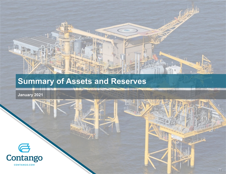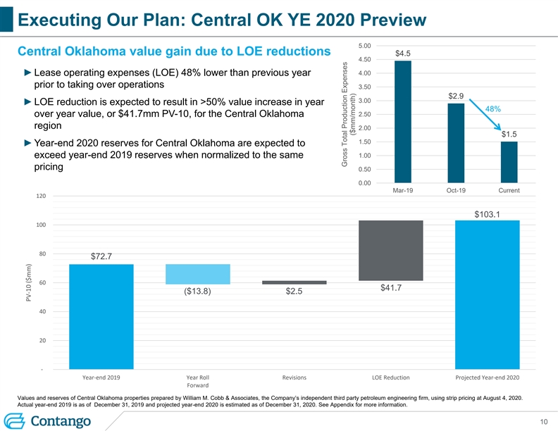 Executing Our Plan: Central OK YE 2020 Preview 5.00 Central Oklahoma value gain due to LOE reductions $4.5 4.50 4.00 ► Lease operating expenses (LOE) 48% lower than previous year prior to taking over operations 3.50 $2.9 3.00 ► LOE reduction is expected to result in >50% value increase in year 48% 2.50 over year value, or $41.7mm PV-10, for the Central Oklahoma region 2.00 $1.5 1.50 ► Year-end 2020 reserves for Central Oklahoma are expected to 1.00 exceed year-end 2019 reserves when normalized to the same pricing 0.50 0.00 Mar-19 Oct-19 Current 120 $103.1 100 80 $72.7 60 $41.7 ($13.8) $2.5 40 20 ‐ Year‐end 2019 Year Roll Revisions LOE Reduction Projected Year‐end 2020 Forward Values and reserves of Central Oklahoma properties prepared by William M. Cobb & Associates, the Company’s independent third party petroleum engineering firm, using strip pricing at August 4, 2020. Actual year-end 2019 is as of December 31, 2019 and projected year-end 2020 is estimated as of December 31, 2020. See Appendix for more information. 10 PV‐10 ($mm) Gross Total Production Expenses ($mm/month)Executing Our Plan: Central OK YE 2020 Preview 5.00 Central Oklahoma value gain due to LOE reductions $4.5 4.50 4.00 ► Lease operating expenses (LOE) 48% lower than previous year prior to taking over operations 3.50 $2.9 3.00 ► LOE reduction is expected to result in >50% value increase in year 48% 2.50 over year value, or $41.7mm PV-10, for the Central Oklahoma region 2.00 $1.5 1.50 ► Year-end 2020 reserves for Central Oklahoma are expected to 1.00 exceed year-end 2019 reserves when normalized to the same pricing 0.50 0.00 Mar-19 Oct-19 Current 120 $103.1 100 80 $72.7 60 $41.7 ($13.8) $2.5 40 20 ‐ Year‐end 2019 Year Roll Revisions LOE Reduction Projected Year‐end 2020 Forward Values and reserves of Central Oklahoma properties prepared by William M. Cobb & Associates, the Company’s independent third party petroleum engineering firm, using strip pricing at August 4, 2020. Actual year-end 2019 is as of December 31, 2019 and projected year-end 2020 is estimated as of December 31, 2020. See Appendix for more information. 10 PV‐10 ($mm) Gross Total Production Expenses ($mm/month)