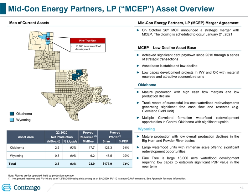MCF Current Asset Overview Map of Current Assets Gulf of Mexico ► Stable production / cash flow base supported by active hedging program Southern Delaware ► Shallow shelf position Pecos Co. • Eugene Island situated in 13’ of water NE Bullseye ► 100% PDP ► Minimal incremental capex and total net P&A liabilities of < $9mm as of June 2020 Bullseye ► Significant upside opportunity via high impact exploratory prospects Southern Delaware ► ~7,700 net operated acres within premier U.S. onshore play Gulf of Mexico • Bullseye: ~5,700 net; NE Bullseye: ~2,000 net Southern Delaware Gulf of Mexico► Acreage materially de-risked from recent development by Contango and Central Oklahoma offset operators • Eugene Island 11 Western Anadarko ► 6 gross wells (2.25 net) to drill in 2021 to fully HBP acreage • Various Prospects Other Onshore • Represents majority of PUD value and capital requirements Note: Additional assets in Kansas, Mississippi, Wyoming and Gulf Coast are not shown ► Targeting WC A, WC B; prospective for Bone Spring ► Midstream integration / optionality – 18.5 miles of water pipeline and 2 active Q2 2020 Proved Proved SWDs (2) (2) Asset Area Net Production Reserves PV-10 Central Oklahoma (MBoe/d) MMBoe $mm % PDP % Liquids ► ~265,000 net acres; long-life, low decline assets with infrastructure Gulf of Mexico 2.7 18% 5.8 $40.6 100% (1) • 93% HBP / 84% operated (1) (1) • Average WI: ~69% / Average NRI: ~56% Southern Delaware 0.9 94% 5.1 26.6 91% ► Multiple target zones focused in the STACK and Cherokee Platform formations Central Oklahoma 9.1 47% 21.1 72.7 96% Western Anadarko 2.5 40% 7.9 29.2 100% Western Anadarko Other Onshore 0.9 60% 3.1 21.6 96% ► ~122,000 net acres; long-life, low decline assets (1) • 95% HBP / ~81% operated Total 16.1 44% 43.0 $190.7 97% (1) (1) • Average WI: ~74% / Average NRI: ~64% ► Low-risk upside potential 1) Figures are for operated, held by production acreage. 2) Net proved reserves and PV-10 are as of 12/31/2019 using strip pricing as of 8/4/2020; excludes reserves associated with ~37% interest in Exaro. PV-10 is a non-GAAP measure. See Appendix for more information. 12MCF Current Asset Overview Map of Current Assets Gulf of Mexico ► Stable production / cash flow base supported by active hedging program Southern Delaware ► Shallow shelf position Pecos Co. • Eugene Island situated in 13’ of water NE Bullseye ► 100% PDP ► Minimal incremental capex and total net P&A liabilities of < $9mm as of June 2020 Bullseye ► Significant upside opportunity via high impact exploratory prospects Southern Delaware ► ~7,700 net operated acres within premier U.S. onshore play Gulf of Mexico • Bullseye: ~5,700 net; NE Bullseye: ~2,000 net Southern Delaware Gulf of Mexico► Acreage materially de-risked from recent development by Contango and Central Oklahoma offset operators • Eugene Island 11 Western Anadarko ► 6 gross wells (2.25 net) to drill in 2021 to fully HBP acreage • Various Prospects Other Onshore • Represents majority of PUD value and capital requirements Note: Additional assets in Kansas, Mississippi, Wyoming and Gulf Coast are not shown ► Targeting WC A, WC B; prospective for Bone Spring ► Midstream integration / optionality – 18.5 miles of water pipeline and 2 active Q2 2020 Proved Proved SWDs (2) (2) Asset Area Net Production Reserves PV-10 Central Oklahoma (MBoe/d) MMBoe $mm % PDP % Liquids ► ~265,000 net acres; long-life, low decline assets with infrastructure Gulf of Mexico 2.7 18% 5.8 $40.6 100% (1) • 93% HBP / 84% operated (1) (1) • Average WI: ~69% / Average NRI: ~56% Southern Delaware 0.9 94% 5.1 26.6 91% ► Multiple target zones focused in the STACK and Cherokee Platform formations Central Oklahoma 9.1 47% 21.1 72.7 96% Western Anadarko 2.5 40% 7.9 29.2 100% Western Anadarko Other Onshore 0.9 60% 3.1 21.6 96% ► ~122,000 net acres; long-life, low decline assets (1) • 95% HBP / ~81% operated Total 16.1 44% 43.0 $190.7 97% (1) (1) • Average WI: ~74% / Average NRI: ~64% ► Low-risk upside potential 1) Figures are for operated, held by production acreage. 2) Net proved reserves and PV-10 are as of 12/31/2019 using strip pricing as of 8/4/2020; excludes reserves associated with ~37% interest in Exaro. PV-10 is a non-GAAP measure. See Appendix for more information. 12