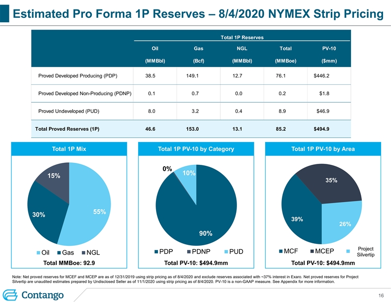Estimated Pro Forma Asset Overview Asset Map Asset and Operating Comparison Project Est. Pro Summary Metrics MCF MCEP Silvertip Forma Proved Reserves 43.0 23.9 18.3 85.2 (1) (MMBoe) Proved PV-10 $190.7 $173.9 $130.3 $494.9 (1) ($mm) Total Debt / (3) 1.09x 6.89x 1.80x 1.86x (2) EBITDAX RCF 9/17/2024 5/1/2021 N/A 9/17/2024 Maturity Date Current and Pro Forma Reserve Mix Project MCF MCEP Est Pro Forma Silvertip 2.7% 48.2% 22.6% 29.9% 70.1% 51.8% 97.3% 77.4% Contango 43.0 MMBoe 23.9 MMBoe 18.3 MMBoe 85.2 MMBoe Offshore Mid-Con Prospects Liquids Gas Project Silvertip Overlapping Acreage Note: Additional Contango assets in Kansas, Mississippi, and Gulf Coast are not shown 1) Net proved reserves for MCF and MCEP are as of 12/31/2019 using strip pricing as of 8/4/2020 and exclude reserves associated with ~37% interest in Exaro. Net proved reserves for Project Silvertip are unaudited estimates prepared by Undisclosed Seller as of 11/1/2020 using strip pricing as of 8/4/2020. PV-10 is a non-GAAP measure. See Appendix for more information. 2) Total debt as of 9/30/2020 and excludes debt associated with PPP loans; MCF & MCEP EBITDAX based on Q1 2020A Adjusted EBITDAX. Silvertip EBITDAX based on Jan and Feb 2020A Adjusted EBTIDAX. EBITDAX is a non-GAAP measure. See Appendix for more information. Debt assumed in Silvertip transaction defined as $58 million purchase price less $22 million of equity capital raised in the private placement. 3) Includes ~$1.9mm in expected annual synergies from the MCF and MCEP merger. 15Estimated Pro Forma Asset Overview Asset Map Asset and Operating Comparison Project Est. Pro Summary Metrics MCF MCEP Silvertip Forma Proved Reserves 43.0 23.9 18.3 85.2 (1) (MMBoe) Proved PV-10 $190.7 $173.9 $130.3 $494.9 (1) ($mm) Total Debt / (3) 1.09x 6.89x 1.80x 1.86x (2) EBITDAX RCF 9/17/2024 5/1/2021 N/A 9/17/2024 Maturity Date Current and Pro Forma Reserve Mix Project MCF MCEP Est Pro Forma Silvertip 2.7% 48.2% 22.6% 29.9% 70.1% 51.8% 97.3% 77.4% Contango 43.0 MMBoe 23.9 MMBoe 18.3 MMBoe 85.2 MMBoe Offshore Mid-Con Prospects Liquids Gas Project Silvertip Overlapping Acreage Note: Additional Contango assets in Kansas, Mississippi, and Gulf Coast are not shown 1) Net proved reserves for MCF and MCEP are as of 12/31/2019 using strip pricing as of 8/4/2020 and exclude reserves associated with ~37% interest in Exaro. Net proved reserves for Project Silvertip are unaudited estimates prepared by Undisclosed Seller as of 11/1/2020 using strip pricing as of 8/4/2020. PV-10 is a non-GAAP measure. See Appendix for more information. 2) Total debt as of 9/30/2020 and excludes debt associated with PPP loans; MCF & MCEP EBITDAX based on Q1 2020A Adjusted EBITDAX. Silvertip EBITDAX based on Jan and Feb 2020A Adjusted EBTIDAX. EBITDAX is a non-GAAP measure. See Appendix for more information. Debt assumed in Silvertip transaction defined as $58 million purchase price less $22 million of equity capital raised in the private placement. 3) Includes ~$1.9mm in expected annual synergies from the MCF and MCEP merger. 15