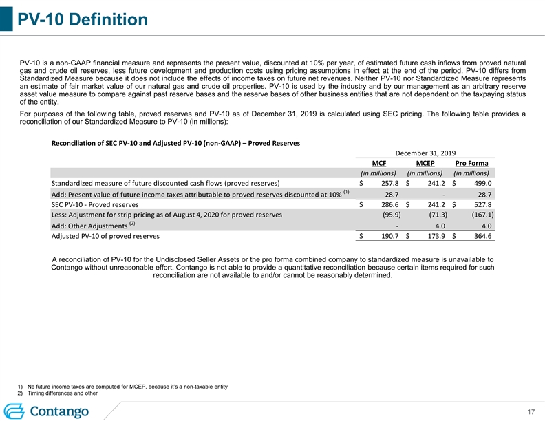 PV-10 Definition PV-10 is a non-GAAP financial measure and represents the present value, discounted at 10% per year, of estimated future cash inflows from proved natural gas and crude oil reserves, less future development and production costs using pricing assumptions in effect at the end of the period. PV-10 differs from Standardized Measure because it does not include the effects of income taxes on future net revenues. Neither PV-10 nor Standardized Measure represents an estimate of fair market value of our natural gas and crude oil properties. PV-10 is used by the industry and by our management as an arbitrary reserve asset value measure to compare against past reserve bases and the reserve bases of other business entities that are not dependent on the taxpaying status of the entity. For purposes of the following table, proved reserves and PV-10 as of December 31, 2019 is calculated using SEC pricing. The following table provides a reconciliation of our Standardized Measure to PV-10 (in millions): Reconciliation of SEC PV‐10 and Adjusted PV‐10 (non‐GAAP) – Proved Reserves December 31, 2019 MCF MCEP Pro Forma (in millions) (in millions) (in millions) Standardized measure of future discounted cash flows (proved reserves) $ 257.8 $ 241.2 $ 499.0 (1) Add: Present value of future income taxes attributable to proved reserves discounted at 10% 28.7 ‐ 28.7 SEC PV‐10 ‐ Proved reserves $ 286.6 $ 241.2 $ 527.8 Less: Adjustment for strip pricing as of August 4, 2020 for proved reserves (95.9) (71.3) (167.1) (2) Add: Other Adjustments ‐ 4.0 4.0 Adjusted PV‐10 of proved reserves $ 190.7 $ 173.9 $ 364.6 A reconciliation of PV-10 for the Undisclosed Seller Assets or the pro forma combined company to standardized measure is unavailable to Contango without unreasonable effort. Contango is not able to provide a quantitative reconciliation because certain items required for such reconciliation are not available to and/or cannot be reasonably determined. 1) No future income taxes are computed for MCEP, because it’s a non-taxable entity 2) Timing differences and other 17PV-10 Definition PV-10 is a non-GAAP financial measure and represents the present value, discounted at 10% per year, of estimated future cash inflows from proved natural gas and crude oil reserves, less future development and production costs using pricing assumptions in effect at the end of the period. PV-10 differs from Standardized Measure because it does not include the effects of income taxes on future net revenues. Neither PV-10 nor Standardized Measure represents an estimate of fair market value of our natural gas and crude oil properties. PV-10 is used by the industry and by our management as an arbitrary reserve asset value measure to compare against past reserve bases and the reserve bases of other business entities that are not dependent on the taxpaying status of the entity. For purposes of the following table, proved reserves and PV-10 as of December 31, 2019 is calculated using SEC pricing. The following table provides a reconciliation of our Standardized Measure to PV-10 (in millions): Reconciliation of SEC PV‐10 and Adjusted PV‐10 (non‐GAAP) – Proved Reserves December 31, 2019 MCF MCEP Pro Forma (in millions) (in millions) (in millions) Standardized measure of future discounted cash flows (proved reserves) $ 257.8 $ 241.2 $ 499.0 (1) Add: Present value of future income taxes attributable to proved reserves discounted at 10% 28.7 ‐ 28.7 SEC PV‐10 ‐ Proved reserves $ 286.6 $ 241.2 $ 527.8 Less: Adjustment for strip pricing as of August 4, 2020 for proved reserves (95.9) (71.3) (167.1) (2) Add: Other Adjustments ‐ 4.0 4.0 Adjusted PV‐10 of proved reserves $ 190.7 $ 173.9 $ 364.6 A reconciliation of PV-10 for the Undisclosed Seller Assets or the pro forma combined company to standardized measure is unavailable to Contango without unreasonable effort. Contango is not able to provide a quantitative reconciliation because certain items required for such reconciliation are not available to and/or cannot be reasonably determined. 1) No future income taxes are computed for MCEP, because it’s a non-taxable entity 2) Timing differences and other 17