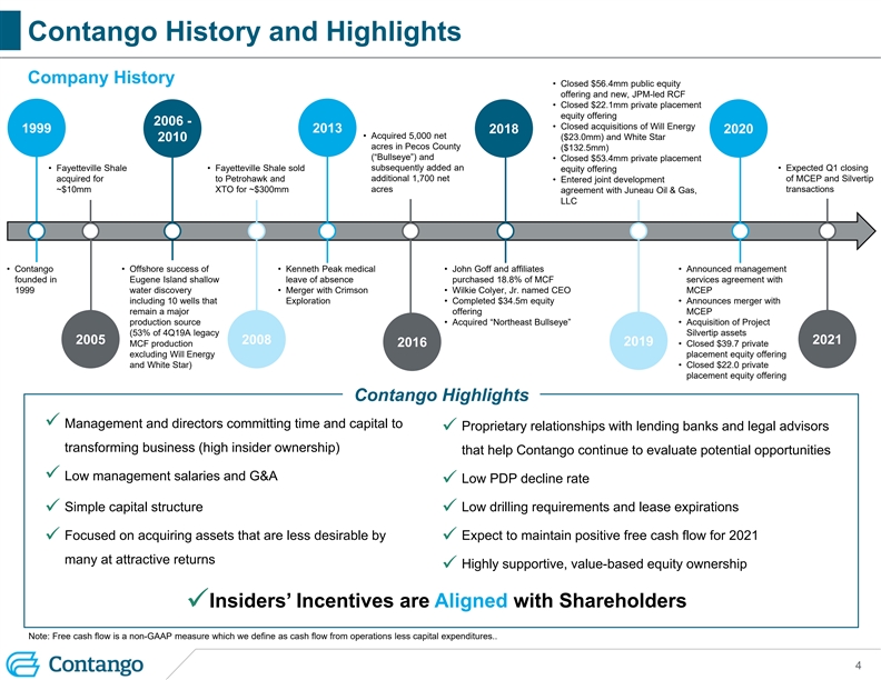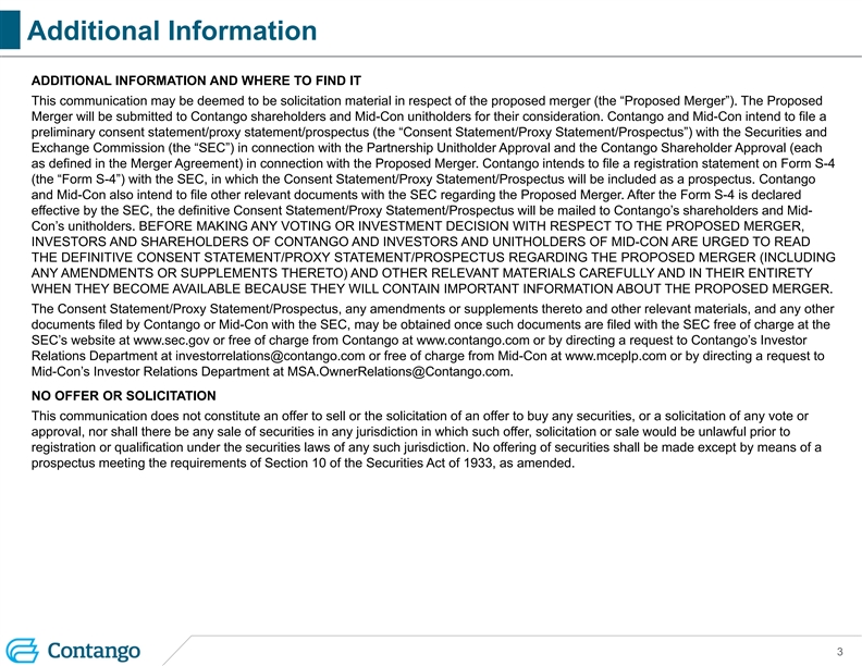 Cautionary Statements Certain statements included in this presentation are forward-looking statements under the Private Securities Litigation Reform Act of 1995. Forward- looking statements are those statements that are not historical in nature and may be identified by words such as, but not limited to, expect, “assume”, “project”, “plan”, outlook, intend, will, “preview,” “estimate,” and could.“ Contango Oil & Gas Company (“Contango”, “MCF” or the “Company”) cautions that strategic plans, assumptions, expectations, objectives for future operations, drilling results, projections, intentions, or beliefs about future events may, and often do, vary from actual results and the differences can be material. Some of the key factors which could cause actual results to vary from those Contango expects include risks related to the COVID-19 pandemic; the risk that the pending acquisition of oil and gas properties may not close as or when expected or produce anticipated benefits; the risk that the merger with Mid-Con Energy Partners, LP (“Mid-Con” or “MCEP”) will not be completed as expected and that, upon completion of the merger (the “Proposed Transaction”) of Mid-Con with and into Contango (the “Combined Company”); the cost savings, synergies and growth from the Proposed Transaction may not be fully realized or may take longer to realize than expected; the diversion of management time on transaction-related issues; the effect of future regulatory or legislative actions on the companies or the industry in which they operate; the risk that the credit ratings of the combined company or its subsidiaries may be different from what the companies expect; the risk that Contango or Mid-Con may be unable to obtain governmental and regulatory approvals required for the Proposed Transaction, or that required governmental and regulatory approvals may delay the Proposed Transaction or result in the imposition of conditions that could reduce the anticipated benefits from the Proposed Transaction or cause the parties to abandon the Proposed Transaction; the risk that a condition to closing of the Proposed Transaction may not be satisfied; the length of time necessary to consummate the Proposed Transaction, which may be longer than anticipated for various reasons; potential liability resulting from pending or future litigation; changes in the general economic environment, or social or political conditions, that could affect the businesses; the potential impact of the announcement or consummation of the Proposed Transaction on relationships with customers, suppliers, competitors, management and other employees; and risks associated with changes in natural gas and oil prices, the timing of planned capital expenditures, availability of acquisitions, uncertainties in estimating proved reserves and resource potential and forecasting drilling and production results, operational factors affecting the commencement or maintenance of producing wells, access to liquidity and compliance with credit agreements, the condition of the capital markets generally, as well as the Company’s ability to access them, and uncertainties regarding environmental regulations or litigation and other legal or regulatory developments affecting Contango's business; and the risk that Contango cannot secure financing for, close as expected, or realize the benefits from, the acquisition of the Project Silvertip assets. Statements regarding future production are subject to all of the risks and uncertainties normally incident to the exploration for and development and production of oil and gas. Please refer to our filings with the Securities and Exchange Commission (“SEC”), including our Annual Report on Form 10-K for the fiscal year ended December 31, 2019, and subsequent filings for a further discussion of these risks. This presentation includes certain estimates of proved reserves that have not been prepared in accordance with SEC pricing guidelines. Other estimates of hydrocarbon quantities included herein may not comport with specific definitions of reserves under SEC rules and cannot be disclosed in SEC filings. These estimates have been prepared by the Company and are by their nature more speculative than estimates of proved reserves and accordingly are subject to substantially greater risk of being actually realized by the Company. Please read “Reserves Disclaimers for certain information regarding the reserves and related information presented herein. Pro Forma for the Combined Company does not necessarily represent the actual reserves, or production or other results of the Combined Company. Although such estimates and any projections shown are based on management's good faith belief and current information available to it, actual results may differ materially from pro forma information, estimates or expectations. This presentation shall not constitute an offer to sell, or a solicitation of an offer to buy, any securities. 2Cautionary Statements Certain statements included in this presentation are forward-looking statements under the Private Securities Litigation Reform Act of 1995. Forward- looking statements are those statements that are not historical in nature and may be identified by words such as, but not limited to, expect, “assume”, “project”, “plan”, outlook, intend, will, “preview,” “estimate,” and could.“ Contango Oil & Gas Company (“Contango”, “MCF” or the “Company”) cautions that strategic plans, assumptions, expectations, objectives for future operations, drilling results, projections, intentions, or beliefs about future events may, and often do, vary from actual results and the differences can be material. Some of the key factors which could cause actual results to vary from those Contango expects include risks related to the COVID-19 pandemic; the risk that the pending acquisition of oil and gas properties may not close as or when expe