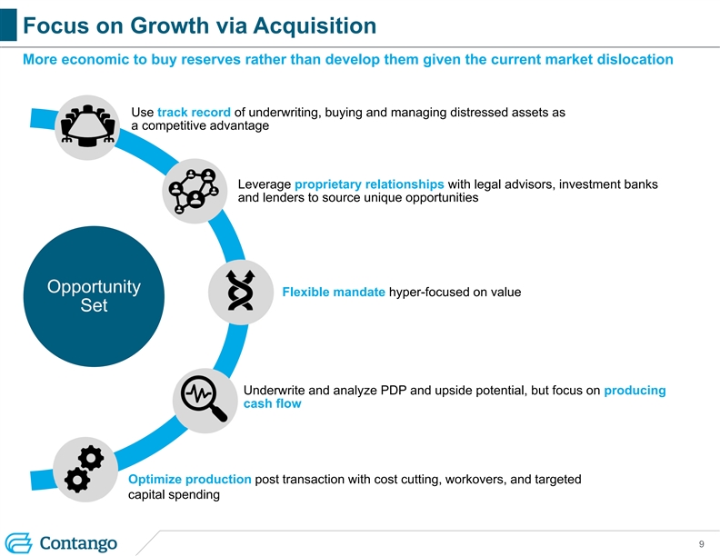 Asset Profile Current & target asset base characteristics yield low capital needs and predictable cash flows through our robust hedging program Asset Profile Low Capital Intensity Low PDP Low Drilling Decline Requirement Minimal Reliance on Drill Bit Few Lease Positive Cash Flow PDP Heavy Expirations 8Asset Profile Current & target asset base characteristics yield low capital needs and predictable cash flows through our robust hedging program Asset Profile Low Capital Intensity Low PDP Low Drilling Decline Requirement Minimal Reliance on Drill Bit Few Lease Positive Cash Flow PDP Heavy Expirations 8