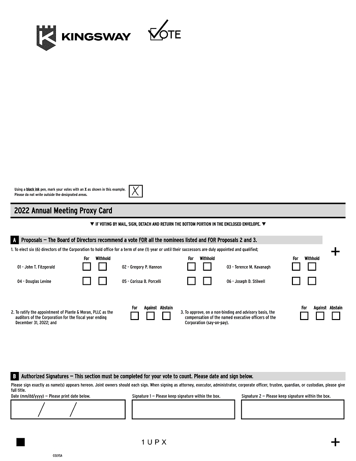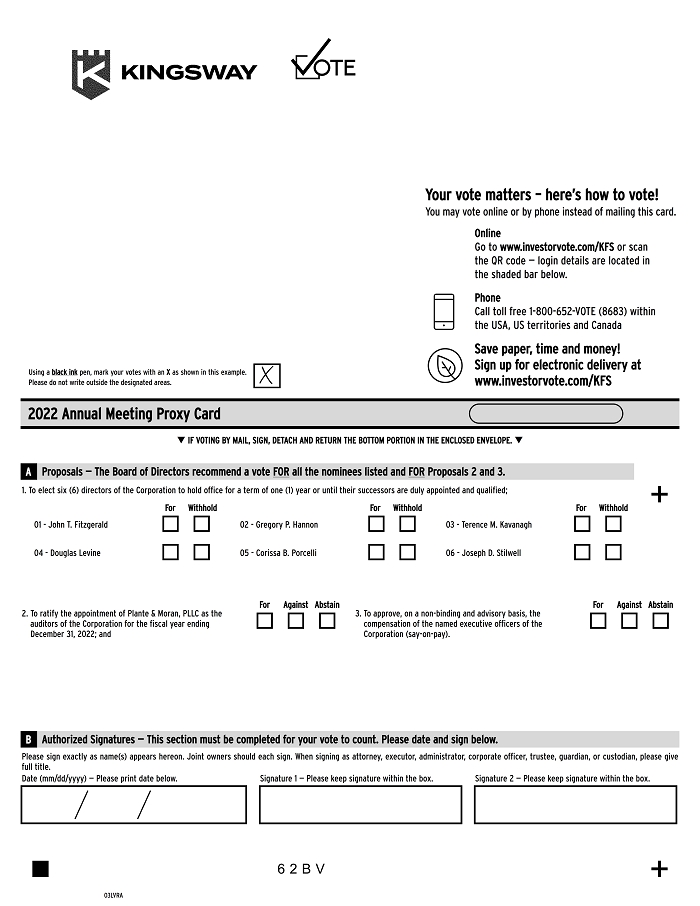 Your vote matters – here’s how to vote! You may vote online or by phone instead of mailing this card. Online Go to www.investorvote.com/KFS or scan the QR code — login details are located in the shaded bar below. Using a black ink pen, mark your votes with an X as shown in this example. Please do not write outside the designated areas. Phone Call toll free 1-800-652-VOTE (8683) within the USA, US territories and Canada Save paper, time and money! Sign up for electronic delivery at www.investorvote.com/KFS 2022 Annual Meeting Proxy Card q IF VOTING BY MAIL, SIGN, DETACH AND RETURN THE BOTTOM PORTION IN THE ENCLOSED ENVELOPE. q A Proposals — The Board of Directors recommend a vote FOR all the nominees listed and FOR Proposals 2 and 3. For Withhold For Withhold For Withhold + 1. To elect six (6) directors of the Corporation to hold office for a term of one (1) year or until their successors are duly appointed and qualified; 01 - John T. Fitzgerald 04 - Douglas Levine 02 - Gregory P. Hannon 05 - Corissa B. Porcelli 03 - Terence M. Kavanagh 06 - Joseph D. Stilwell 2. To ratify the appointment of Plante & Moran, PLLC as the auditors of the Corporation for the fiscal year ending December 31, 2022; and For Against Abstain 3. To approve, on a non-binding and advisory basis, the compensation of the named executive officers of the Corporation (say-on-pay). For Against Abstain B Authorized Signatures — This section must be completed for your vote to count. Please date and sign below. Please sign exactly as name(s) appears hereon. Joint owners should each sign. When signing as attorney, executor, administrator, corporate officer, trustee, guardian, or custodian, please give full title. Date (mm/dd/yyyy) — Please print date below. Signature 1 — Please keep signature within the box. Signature 2 — Please keep signature within the box. 03LVRA 6 2 B V + 2022 Annual Meeting of Kingsway Financial Services Inc. Shareholders The 2022 Annual Meeting of Shareholders of Kingsway Financial Services Inc will be held on May 17, 2022 at 9:00 am CT, virtually via the Internet at meetnow.global/MMVKCMR. To access the virtual meeting, you must have the information that is printed in the shaded bar located on the reverse side of this form. Important notice regarding the Internet availability of proxy materials for the Annual Meeting of Shareholders. The material is available at: www.investorvote.com/KFS