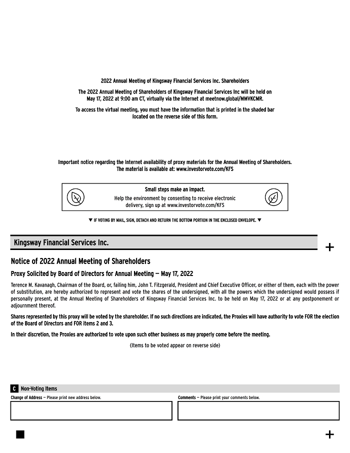 Small steps make an impact. Help the environment by consenting to receive electronic delivery, sign up at www.investorvote.com/KFS q IF VOTING BY MAIL, SIGN, DETACH AND RETURN THE BOTTOM PORTION IN THE ENCLOSED ENVELOPE. q Kingsway Financial Services Inc. + Notice of 2022 Annual Meeting of Shareholders Proxy Solicited by Board of Directors for Annual Meeting — May 17, 2022 Terence M. Kavanagh, Chairman of the Board, or, failing him, John T. Fitzgerald, President and Chief Executive Officer, or either of them, each with the power of substitution, are hereby authorized to represent and vote the shares of the undersigned, with all the powers which the undersigned would possess if personally present, at the Annual Meeting of Shareholders of Kingsway Financial Services Inc. to be held on May 17, 2022 or at any postponement or adjournment thereof. Shares represented by this proxy will be voted by the shareholder. If no such directions are indicated, the Proxies will have authority to vote FOR the election of the Board of Directors and FOR items 2 and 3. In their discretion, the Proxies are authorized to vote upon such other business as may properly come before the meeting. (Items to be voted appear on reverse side) C Non-Voting Items Change of Address — Please print new address below. Comments — Please print your comments below. +
