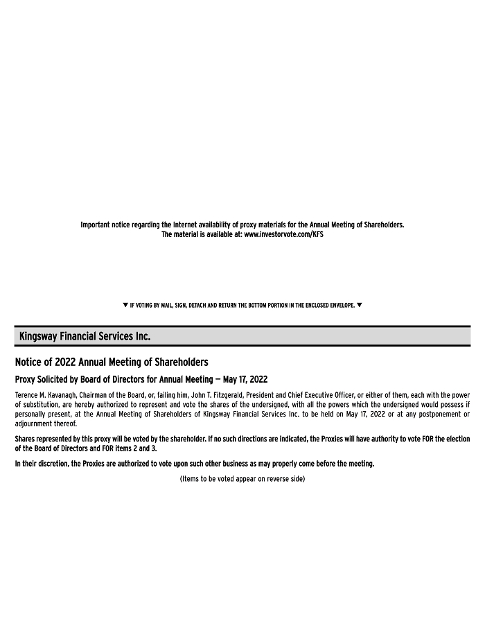 q IF VOTING BY MAIL, SIGN, DETACH AND RETURN THE BOTTOM PORTION IN THE ENCLOSED ENVELOPE. q Kingsway Financial Services Inc. Notice of 2022 Annual Meeting of Shareholders Proxy Solicited by Board of Directors for Annual Meeting — May 17, 2022 Terence M. Kavanagh, Chairman of the Board, or, failing him, John T. Fitzgerald, President and Chief Executive Officer, or either of them, each with the power of substitution, are hereby authorized to represent and vote the shares of the undersigned, with all the powers which the undersigned would possess if personally present, at the Annual Meeting of Shareholders of Kingsway Financial Services Inc. to be held on May 17, 2022 or at any postponement or adjournment thereof. Shares represented by this proxy will be voted by the shareholder. If no such directions are indicated, the Proxies will have authority to vote FOR the election of the Board of Directors and FOR items 2 and 3. In their discretion, the Proxies are authorized to vote upon such other business as may properly come before the meeting. (Items to be voted appear on reverse side)