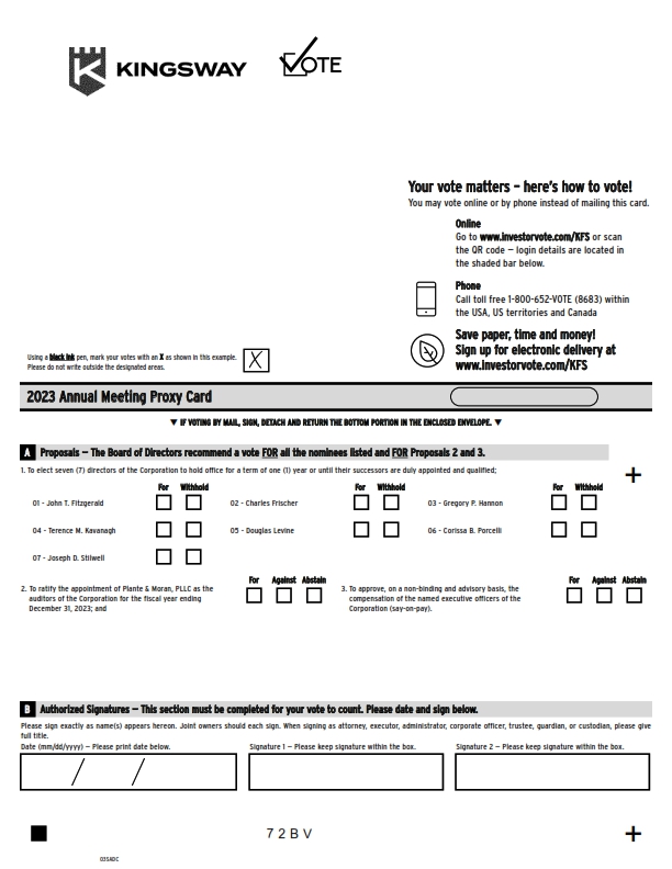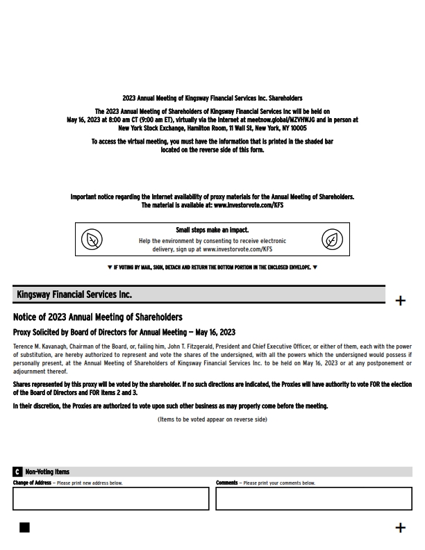 2023 Annual Meeting of Kingsway Financial Services Inc. Shareholders The 2023 Annual Meeting of Shareholders of Kingsway Financial Services Inc will be held on May 16, 2023 at 8:00 am CT (9:00 am ET), virtually via the Internet at meetnow.global/MZVHWJG and in person at New York Stock Exchange, Hamilton Room, 11 Wall St, New York, NY 10005 To access the virtual meeting, you must have the information that is printed in the shaded bar located on the reverse side of this form. Important notice regarding the Internet availability of proxy materials for the Annual Meeting of Shareholders. The material is available at: www.investorvote.com/KFS Small steps make an impact. Help the environment by consenting to receive electronic delivery, sign up at www.investorvote.com/KFS q IF VOTING BY MAIL, SIGN, DETACH AND RETURN THE BOTTOM PORTION IN THE ENCLOSED ENVELOPE. q Kingsway Financial Services Inc. + Notice of 2023 Annual Meeting of Shareholders Proxy Solicited by Board of Directors for Annual Meeting — May 16, 2023 Terence M. Kavanagh, Chairman of the Board, or, failing him, John T. Fitzgerald, President and Chief Executive Officer, or either of them, each with the power of substitution, are hereby authorized to represent and vote the shares of the undersigned, with all the powers which the undersigned would possess if personally present, at the Annual Meeting of Shareholders of Kingsway Financial Services Inc. to be held on May 16, 2023 or at any postponement or adjournment thereof. Shares represented by this proxy will be voted by the shareholder. If no such directions are indicated, the Proxies will have authority to vote FOR the election of the Board of Directors and FOR items 2 and 3. In their discretion, the Proxies are authorized to vote upon such other business as may properly come before the meeting. (Items to be voted appear on reverse side) C Non-Voting Items Change of Address — Please print new address below. Comments — Please print your comments below. +