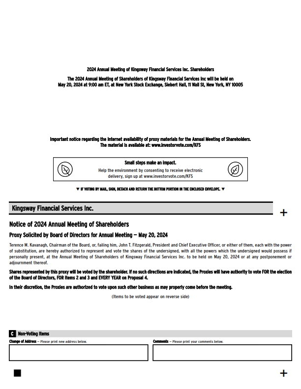 2024 Annual Meeting of Kingsway Financial Services Inc. Shareholders The 2024 Annual Meeting of Shareholders of Kingsway Financial Services Inc will be held on May 20, 2024 at 9:00 am ET, at New York Stock Exchange, Siebert Hall, 11 Wall St, New York, NY 10005 Important notice regarding the Internet availability of proxy materials for the Annual Meeting of Shareholders. The material is available at: www.investorvote.com/KFS Small steps make an impact. Help the environment by consenting to receive electronic delivery, sign up at www.investorvote.com/KFS q IF VOTING BY MAIL, SIGN, DETACH AND RETURN THE BOTTOM PORTION IN THE ENCLOSED ENVELOPE. q Kingsway Financial Services Inc. + Notice of 2024 Annual Meeting of Shareholders Proxy Solicited by Board of Directors for Annual Meeting — May 20, 2024 Terence M. Kavanagh, Chairman of the Board, or, failing him, John T. Fitzgerald, President and Chief Executive Officer, or either of them, each with the power of substitution, are hereby authorized to represent and vote the shares of the undersigned, with all the powers which the undersigned would possess if personally present, at the Annual Meeting of Shareholders of Kingsway Financial Services Inc. to be held on May 20, 2024 or at any postponement or adjournment thereof. Shares represented by this proxy will be voted by the shareholder. If no such directions are indicated, the Proxies will have authority to vote FOR the election of the Board of Directors, FOR items 2 and 3 and EVERY YEAR on Proposal 4. In their discretion, the Proxies are authorized to vote upon such other business as may properly come before the meeting. (Items to be voted appear on reverse side) C Non-Voting Items Change of Address — Please print new address below. Comments — Please print your comments below. +