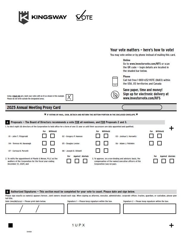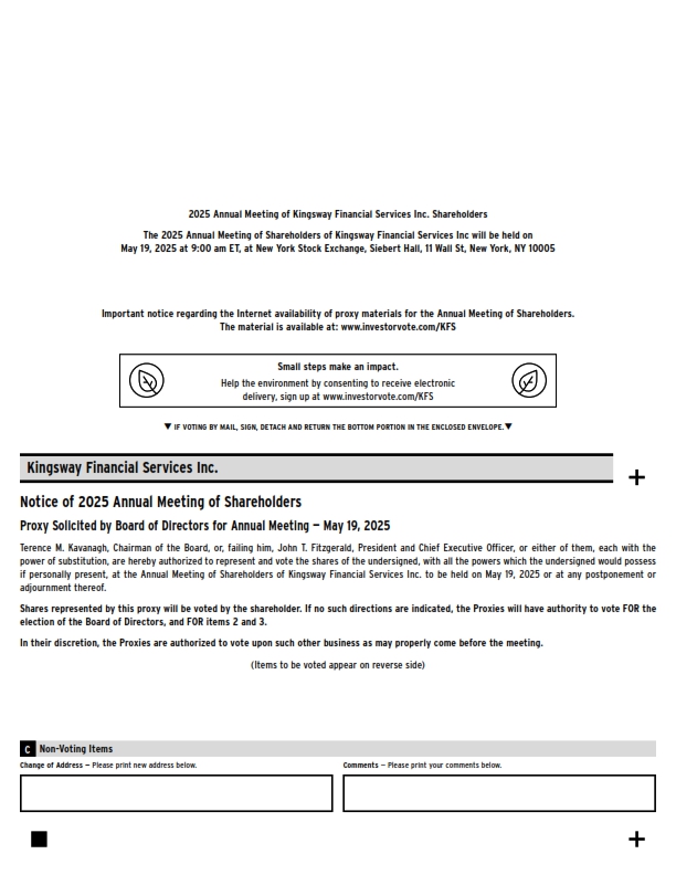 2025 Annual Meeting of Kingsway Financial Services Inc. Shareholders The 2025 Annual Meeting of Shareholders of Kingsway Financial Services Inc will be held on May 19, 2025 at 9:00 am ET, at New York Stock Exchange, Siebert Hall, 11 Wall St, New York, NY 10005 Important notice regarding the Internet availability of proxy materials for the Annual Meeting of Shareholders. The material is available at: www.investorvote.com/KFS Small steps make an impact. Help the environment by consenting to receive electronic delivery, sign up at www.investorvote.com/KFS q IF VOTING BY MAIL, SIGN, DETACH AND RETURN THE BOTTOM PORTION IN THE ENCLOSED ENVELOPE.q Kingsway Financial Services Inc. Notice of 2025 Annual Meeting of Shareholders Proxy Solicited by Board of Directors for Annual Meeting — May 19, 2025 Terence M. Kavanagh, Chairman of the Board, or, failing him, John T. Fitzgerald, President and Chief Executive Officer, or either of them, each with the power of substitution, are hereby authorized to represent and vote the shares of the undersigned, with all the powers which the undersigned would possess if personally present, at the Annual Meeting of Shareholders of Kingsway Financial Services Inc. to be held on May 19, 2025 or at any postponement or adjournment thereof. Shares represented by this proxy will be voted by the shareholder. If no such directions are indicated, the Proxies will have authority to vote FOR the election of the Board of Directors, and FOR items 2 and 3. In their discretion, the Proxies are authorized to vote upon such other business as may properly come before the meeting. (Items to be voted appear on reverse side) C Non-Voting Items Change of Address — Please print new address below. Comments — Please print your comments below.