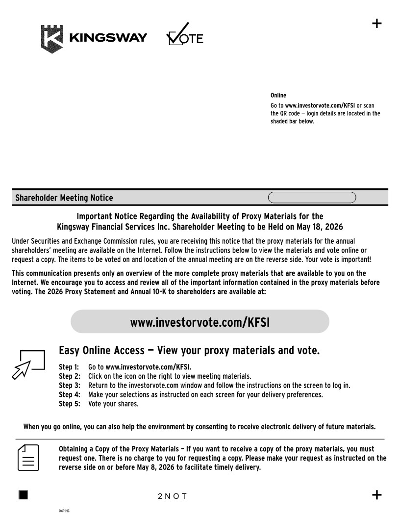 Online Go to www.investorvote.com/KFSI or scan the QR code — login details are located in the shaded bar below. Shareholder Meeting Notice Important Notice Regarding the Availability of Proxy Materials for the Kingsway Financial Services Inc. Shareholder Meeting to be Held on May 18, 2026 Under Securities and Exchange Commission rules, you are receiving this notice that the proxy materials for the annual shareholders’ meeting are available on the Internet. Follow the instructions below to view the materials and vote online or request a copy. The items to be voted on and location of the annual meeting are on the reverse side. Your vote is important! This communication presents only an overview of the more complete proxy materials that are available to you on the Internet. We encourage you to access and review all of the important information contained in the proxy materials before voting. The 2026 Proxy Statement and Annual 10-K to shareholders are available at: www.investorvote.com/KFSI Easy Online Access — View your proxy materials and vote. Step 1: Go to www.investorvote.com/KFSI. Step 2: Click on the icon on the right to view meeting materials. Step 3: Return to the investorvote.com window and follow the instructions on the screen to log in. Step 4: Make your selections as instructed on each screen for your delivery preferences. Step 5: Vote your shares. When you go online, you can also help the environment by consenting to receive electronic delivery of future materials. Obtaining a Copy of the Proxy Materials – If you want to receive a copy of the proxy materials, you must request one. There is no charge to you for requesting a copy. Please make your request as instructed on the reverse side on or before May 8, 2026 to facilitate timely delivery. 2 N O T 0491HC