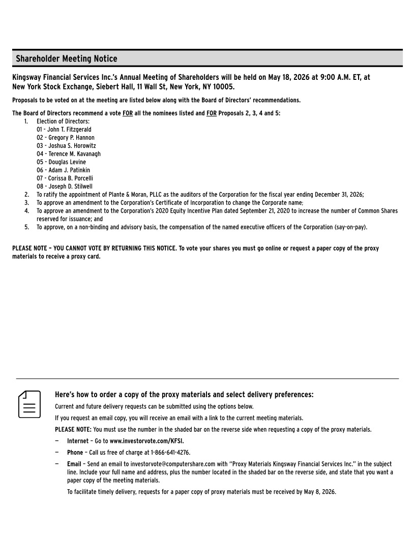 Shareholder Meeting Notice Kingsway Financial Services Inc.’s Annual Meeting of Shareholders will be held on May 18, 2026 at 9:00 A.M. ET, at New York Stock Exchange, Siebert Hall, 11 Wall St, New York, NY 10005. Proposals to be voted on at the meeting are listed below along with the Board of Directors’ recommendations. The Board of Directors recommend a vote FOR all the nominees listed and FOR Proposals 2, 3, 4 and 5: 1. Election of Directors: 01 - John T. Fitzgerald 02 - Gregory P. Hannon 03 - Joshua S. Horowitz 04 - Terence M. Kavanagh 05 - Douglas Levine 06 - Adam J. Patinkin 07 - Corissa B. Porcelli 08 - Joseph D. Stilwell 2. To ratify the appointment of Plante & Moran, PLLC as the auditors of the Corporation for the fiscal year ending December 31, 2026; 3. To approve an amendment to the Corporation’s Certificate of Incorporation to change the Corporate name; 4. To approve an amendment to the Corporation’s 2020 Equity Incentive Plan dated September 21, 2020 to increase the number of Common Shares reserved for issuance; and 5. To approve, on a non-binding and advisory basis, the compensation of the named executive officers of the Corporation (say-on-pay). PLEASE NOTE – YOU CANNOT VOTE BY RETURNING THIS NOTICE. To vote your shares you must go online or request a paper copy of the proxy materials to receive a proxy card. Here’s how to order a copy of the proxy materials and select delivery preferences: Current and future delivery requests can be submitted using the options below. If you request an email copy, you will receive an email with a link to the current meeting materials. PLEASE NOTE: You must use the number in the shaded bar on the reverse side when requesting a copy of the proxy materials. — Internet – Go to www.investorvote.com/KFSI. — Phone – Call us free of charge at 1-866-641-4276. — Email – Send an email to investorvote@computershare.com with “Proxy Materials Kingsway Financial Services Inc.” in the subject line. Include your full name and address, plus the number located in the shaded bar on the reverse side, and state that you want a paper copy of the meeting materials. To facilitate timely delivery, requests for a paper copy of proxy materials must be received by May 8, 2026.