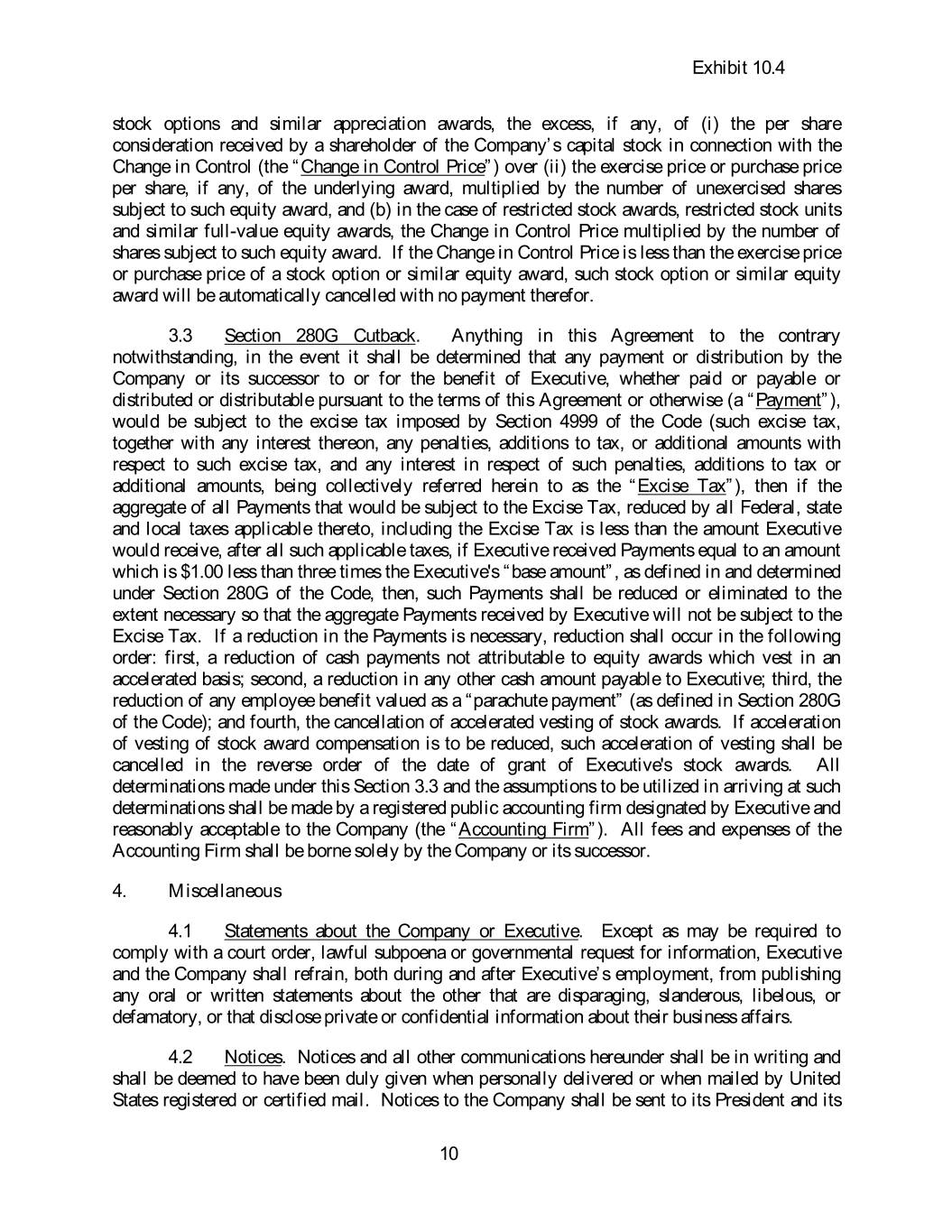 Exhibit 10.4 stock options and similar appreciation awards, the excess, if any, of (i) the per share consideration received by a shareholder of the Company’s capital stock in connection with the Change in Control (the “Change in Control Price”) over (ii) the exercise price or purchase price per share, if any, of the underlying award, multiplied by the number of unexercised shares subject to such equity award, and (b) in the case of restricted stock awards, restricted stock units and similar full-value equity awards, the Change in Control Price multiplied by the number of shares subject to such equity award. If the Change in Control Price is less than the exercise price or purchase price of a stock option or similar equity award, such stock option or similar equity award will be automatically cancelled with no payment therefor. 3.3 Section 280G Cutback. Anything in this Agreement to the contrary notwithstanding, in the event it shall be determined that any payment or distribution by the Company or its successor to or for the benefit of Executive, whether paid or payable or distributed or distributable pursuant to the terms of this Agreement or otherwise (a “Payment”), would be subject to the excise tax imposed by Section 4999 of the Code (such excise tax, together with any interest thereon, any penalties, additions to tax, or additional amounts with respect to such excise tax, and any interest in respect of such penalties, additions to tax or additional amounts, being collectively referred herein to as the “Excise Tax”), then if the aggregate of all Payments that would be subject to the Excise Tax, reduced by all Federal, state and local taxes applicable thereto, including the Excise Tax is less than the amount Executive would receive, after all such applicable taxes, if Executive received Payments equal to an amount which is $1.00 less than three times the Executive's “base amount”, as defined in and determined under Section 280G of the Code, then, such Payments shall be reduced or eliminated to the extent necessary so that the aggregate Payments received by Executive will not be subject to the Excise Tax. If a reduction in the Payments is necessary, reduction shall occur in the following order: first, a reduction of cash payments not attributable to equity awards which vest in an accelerated basis; second, a reduction in any other cash amount payable to Executive; third, the reduction of any employee benefit valued as a “parachute payment” (as defined in Section 280G of the Code); and fourth, the cancellation of accelerated vesting of stock awards. If acceleration of vesting of stock award compensation is to be reduced, such acceleration of vesting shall be cancelled in the reverse order of the date of grant of Executive's stock awards. All determinations made under this Section 3.3 and the assumptions to be utilized in arriving at such determinations shall be made by a registered public accounting firm designated by Executive and reasonably acceptable to the Company (the “Accounting Firm”). All fees and expenses of the Accounting Firm shall be borne solely by the Company or its successor. 4. Miscellaneous 4.1 Statements about the Company or Executive. Except as may be required to comply with a court order, lawful subpoena or governmental request for information, Executive and the Company shall refrain, both during and after Executive’s employment, from publishing any oral or written statements about the other that are disparaging, slanderous, libelous, or defamatory, or that disclose private or confidential information about their business affairs. 4.2 Notices. Notices and all other communications hereunder shall be in writing and shall be deemed to have been duly given when personally delivered or when mailed by United States registered or certified mail. Notices to the Company shall be sent to its President and its 10
