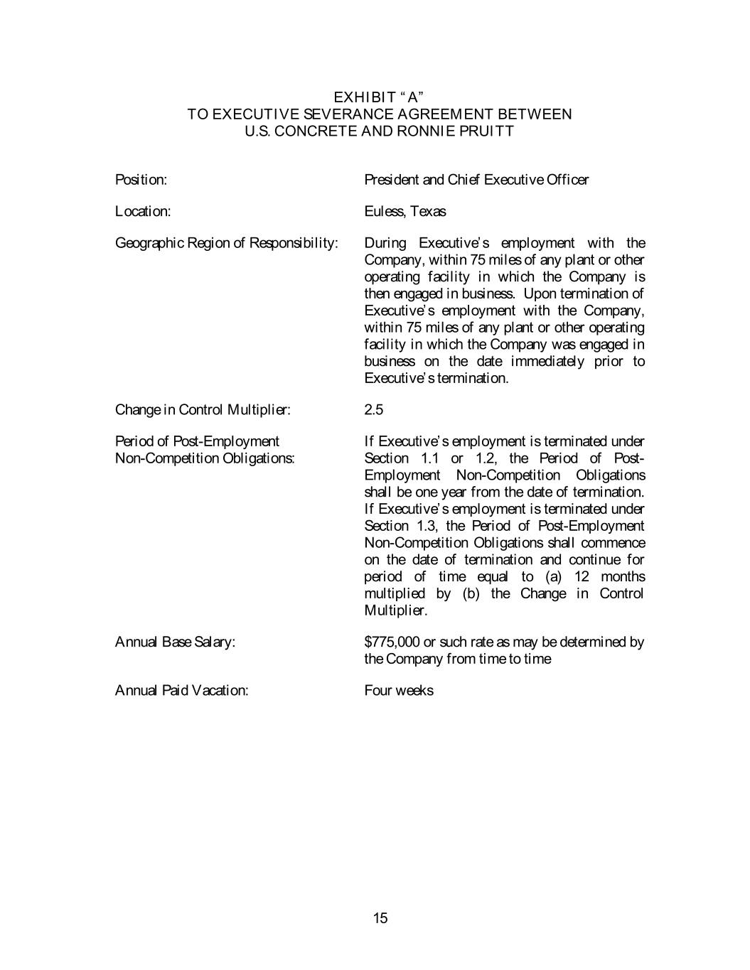 EXHIBIT “A” TO EXECUTIVE SEVERANCE AGREEMENT BETWEEN U.S. CONCRETE AND RONNIE PRUITT Position: President and Chief Executive Officer Location: Euless, Texas Geographic Region of Responsibility: During Executive’s employment with the Company, within 75 miles of any plant or other operating facility in which the Company is then engaged in business. Upon termination of Executive’s employment with the Company, within 75 miles of any plant or other operating facility in which the Company was engaged in business on the date immediately prior to Executive’s termination. Change in Control Multiplier: 2.5 Period of Post-Employment If Executive’s employment is terminated under Non-Competition Obligations: Section 1.1 or 1.2, the Period of Post- Employment Non-Competition Obligations shall be one year from the date of termination. If Executive’s employment is terminated under Section 1.3, the Period of Post-Employment Non-Competition Obligations shall commence on the date of termination and continue for period of time equal to (a) 12 months multiplied by (b) the Change in Control Multiplier. Annual Base Salary: $775,000 or such rate as may be determined by the Company from time to time Annual Paid Vacation: Four weeks 15