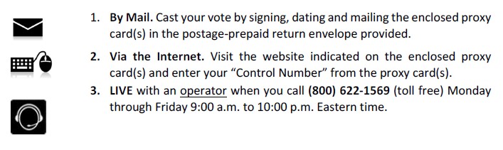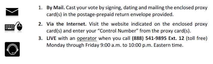 If, as of October 29, 2020, you held an Adjourned Fund’s shares through an intermediary (such as a broker-dealer) and you wish to participate in and vote at the adjourned Meeting, you will need to obtain a legal proxy from your intermediary reflecting the Fund’s name, the number of Fund shares held and your name and email address. You may forward an email from your intermediary containing the legal proxy or attach an image of the legal proxy to an email and send it to AST at attendameeting@astfinancial.com with “Legal Proxy” in the subject line. You will then be provided with credentials to participate in the Meeting, as well as a unique control number to vote your shares at the Meeting. If you would like to participate in, but NOT vote at, the Meeting, please send an email to AST at attendameeting@astfinancial.com with proof of ownership of Fund shares. A statement, letter or the Vote Instruction Form from your intermediary will be sufficient proof of ownership. You will then be provided with credentials to participate in the Meeting. All requests to participate in the Meeting must be received by AST by no later than 3:00 p.m. Eastern Time on January 21, 2021.