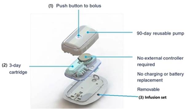 2. The pump snaps together with a three-day disposable cartridge, which the patient fills with insulin for delivery. It includes a simple coin cell, which allows it to run through the 80-hour life of the cartridge.