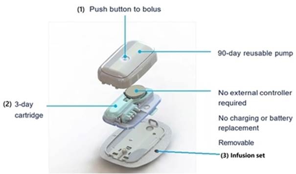 3. The infusion set is built into the adhesive pad that the pump attaches to and the needle can be safely removed and discarded by the user after application. Despite this true patch form factor, the pump is removable by the user during the three days of wear.