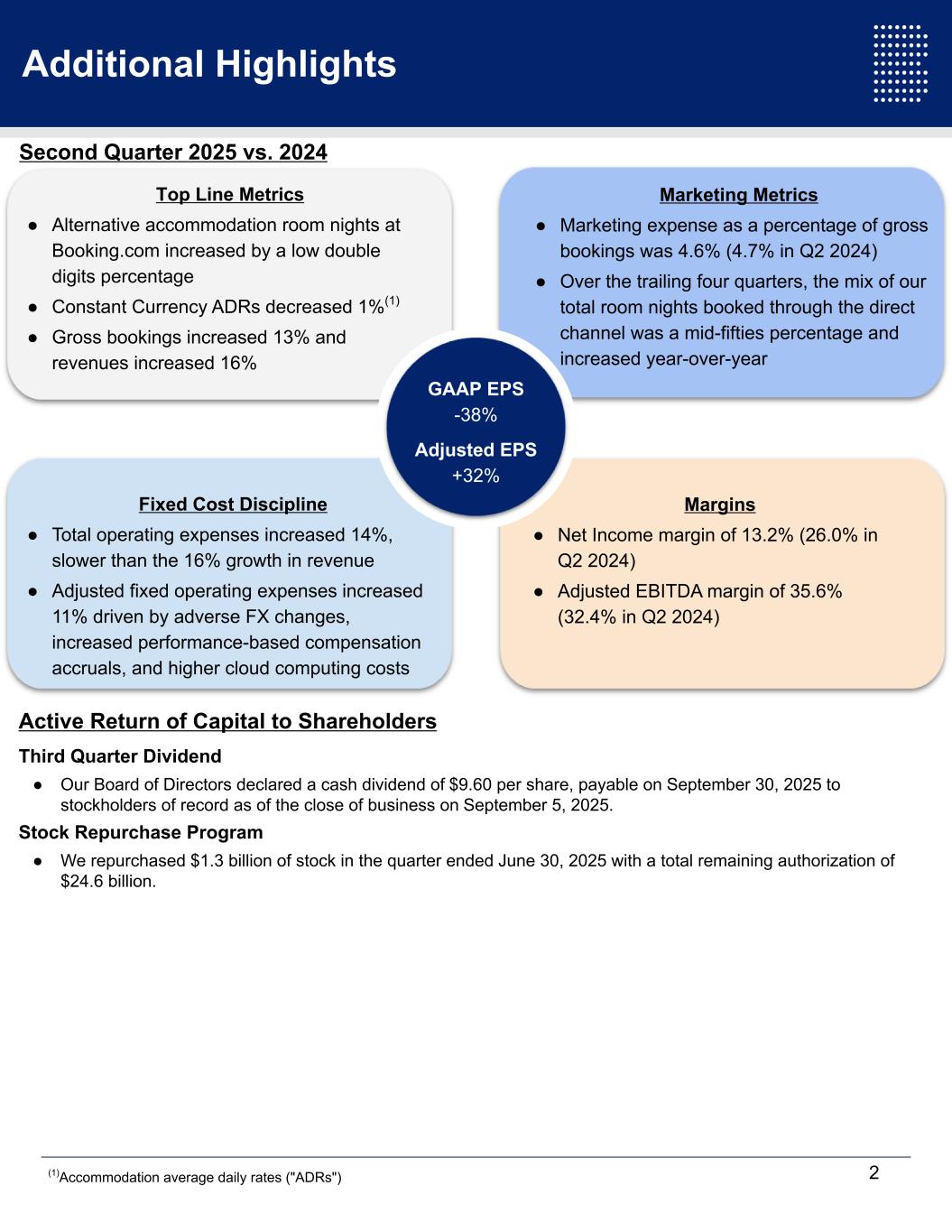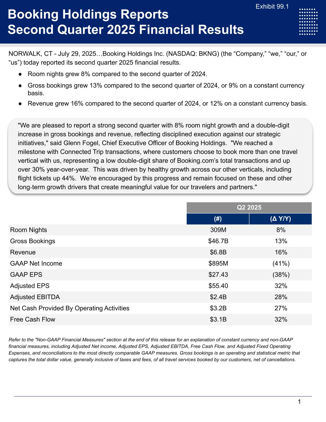 Booking Holdings Reports Second Quarter 2025 Financial Results NORWALK, CT - July 29, 2025…Booking Holdings Inc. (NASDAQ: BKNG) (the “Company,” “we,” “our,” or “us”) today reported its second quarter 2025 financial results. ● Room nights grew 8% compared to the second quarter of 2024. ● Gross bookings grew 13% compared to the second quarter of 2024, or 9% on a constant currency basis. ● Revenue grew 16% compared to the second quarter of 2024, or 12% on a constant currency basis. Q2 2025 (#) (Δ Y/Y) Room Nights 309M 8% Gross Bookings $46.7B 13% Revenue $6.8B 16% GAAP Net Income $895M (41%) GAAP EPS $27.43 (38%) Adjusted EPS $55.40 32% Adjusted EBITDA $2.4B 28% Net Cash Provided By Operating Activities $3.2B 27% Free Cash Flow $3.1B 32% 1 "We are pleased to report a strong second quarter with 8% room night growth and a double-digit increase in gross bookings and revenue, reflecting disciplined execution against our strategic initiatives," said Glenn Fogel, Chief Executive Officer of Booking Holdings. "We reached a milestone with Connected Trip transactions, where customers choose to book more than one travel vertical with us, representing a low double-digit share of Booking.com’s total transactions and up over 30% year-over-year. This was driven by healthy growth across our other verticals, including flight tickets up 44%. We’re encouraged by this progress and remain focused on these and other long-term growth drivers that create meaningful value for our travelers and partners." Refer to the "Non-GAAP Financial Measures" section at the end of this release for an explanation of constant currency and non-GAAP financial measures, including Adjusted Net income, Adjusted EPS, Adjusted EBITDA, Free Cash Flow, and Adjusted Fixed Operating Expenses, and reconciliations to the most directly comparable GAAP measures. Gross bookings is an operating and statistical metric that captures the total dollar value, generally inclusive of taxes and fees, of all travel services booked by our customers, net of cancellations.