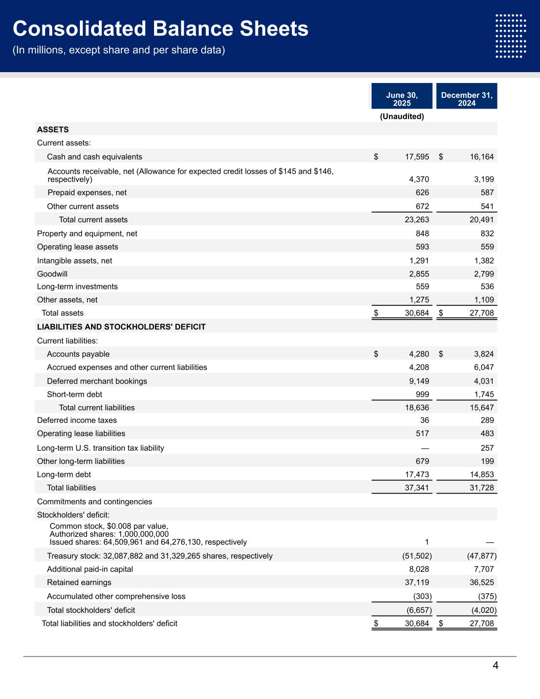 Consolidated Balance Sheets (In millions, except share and per share data) June 30, 2025 December 31, 2024 (Unaudited) ASSETS Current assets: Cash and cash equivalents $ 17,595 $ 16,164 Accounts receivable, net (Allowance for expected credit losses of $145 and $146, respectively) 4,370 3,199 Prepaid expenses, net 626 587 Other current assets 672 541 Total current assets 23,263 20,491 Property and equipment, net 848 832 Operating lease assets 593 559 Intangible assets, net 1,291 1,382 Goodwill 2,855 2,799 Long-term investments 559 536 Other assets, net 1,275 1,109 Total assets $ 30,684 $ 27,708 LIABILITIES AND STOCKHOLDERS' DEFICIT Current liabilities: Accounts payable $ 4,280 $ 3,824 Accrued expenses and other current liabilities 4,208 6,047 Deferred merchant bookings 9,149 4,031 Short-term debt 999 1,745 Total current liabilities 18,636 15,647 Deferred income taxes 36 289 Operating lease liabilities 517 483 Long-term U.S. transition tax liability — 257 Other long-term liabilities 679 199 Long-term debt 17,473 14,853 Total liabilities 37,341 31,728 Commitments and contingencies Stockholders' deficit: Common stock, $0.008 par value, Authorized shares: 1,000,000,000 Issued shares: 64,509,961 and 64,276,130, respectively 1 — Treasury stock: 32,087,882 and 31,329,265 shares, respectively (51,502) (47,877) Additional paid-in capital 8,028 7,707 Retained earnings 37,119 36,525 Accumulated other comprehensive loss (303) (375) Total stockholders' deficit (6,657) (4,020) Total liabilities and stockholders' deficit $ 30,684 $ 27,708 4