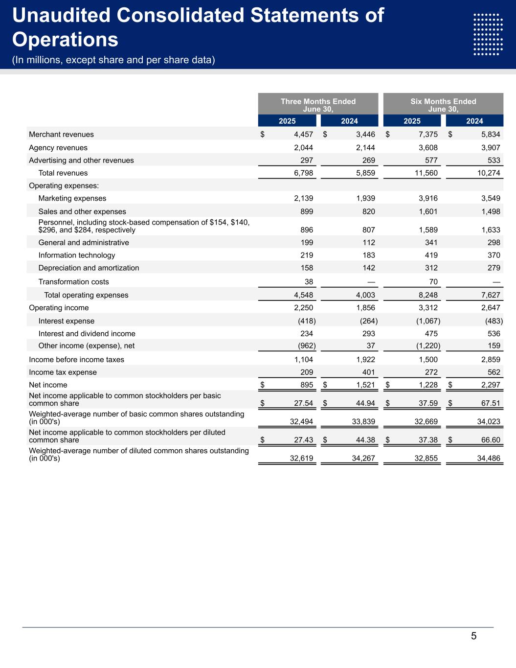 Unaudited Consolidated Statements of Operations (In millions, except share and per share data) Three Months Ended June 30, Six Months Ended June 30, 2025 2024 2025 2024 Merchant revenues $ 4,457 $ 3,446 $ 7,375 $ 5,834 Agency revenues 2,044 2,144 3,608 3,907 Advertising and other revenues 297 269 577 533 Total revenues 6,798 5,859 11,560 10,274 Operating expenses: Marketing expenses 2,139 1,939 3,916 3,549 Sales and other expenses 899 820 1,601 1,498 Personnel, including stock-based compensation of $154, $140, $296, and $284, respectively 896 807 1,589 1,633 General and administrative 199 112 341 298 Information technology 219 183 419 370 Depreciation and amortization 158 142 312 279 Transformation costs 38 — 70 — Total operating expenses 4,548 4,003 8,248 7,627 Operating income 2,250 1,856 3,312 2,647 Interest expense (418) (264) (1,067) (483) Interest and dividend income 234 293 475 536 Other income (expense), net (962) 37 (1,220) 159 Income before income taxes 1,104 1,922 1,500 2,859 Income tax expense 209 401 272 562 Net income $ 895 $ 1,521 $ 1,228 $ 2,297 Net income applicable to common stockholders per basic common share $ 27.54 $ 44.94 $ 37.59 $ 67.51 Weighted-average number of basic common shares outstanding (in 000's) 32,494 33,839 32,669 34,023 Net income applicable to common stockholders per diluted common share $ 27.43 $ 44.38 $ 37.38 $ 66.60 Weighted-average number of diluted common shares outstanding (in 000's) 32,619 34,267 32,855 34,486 5