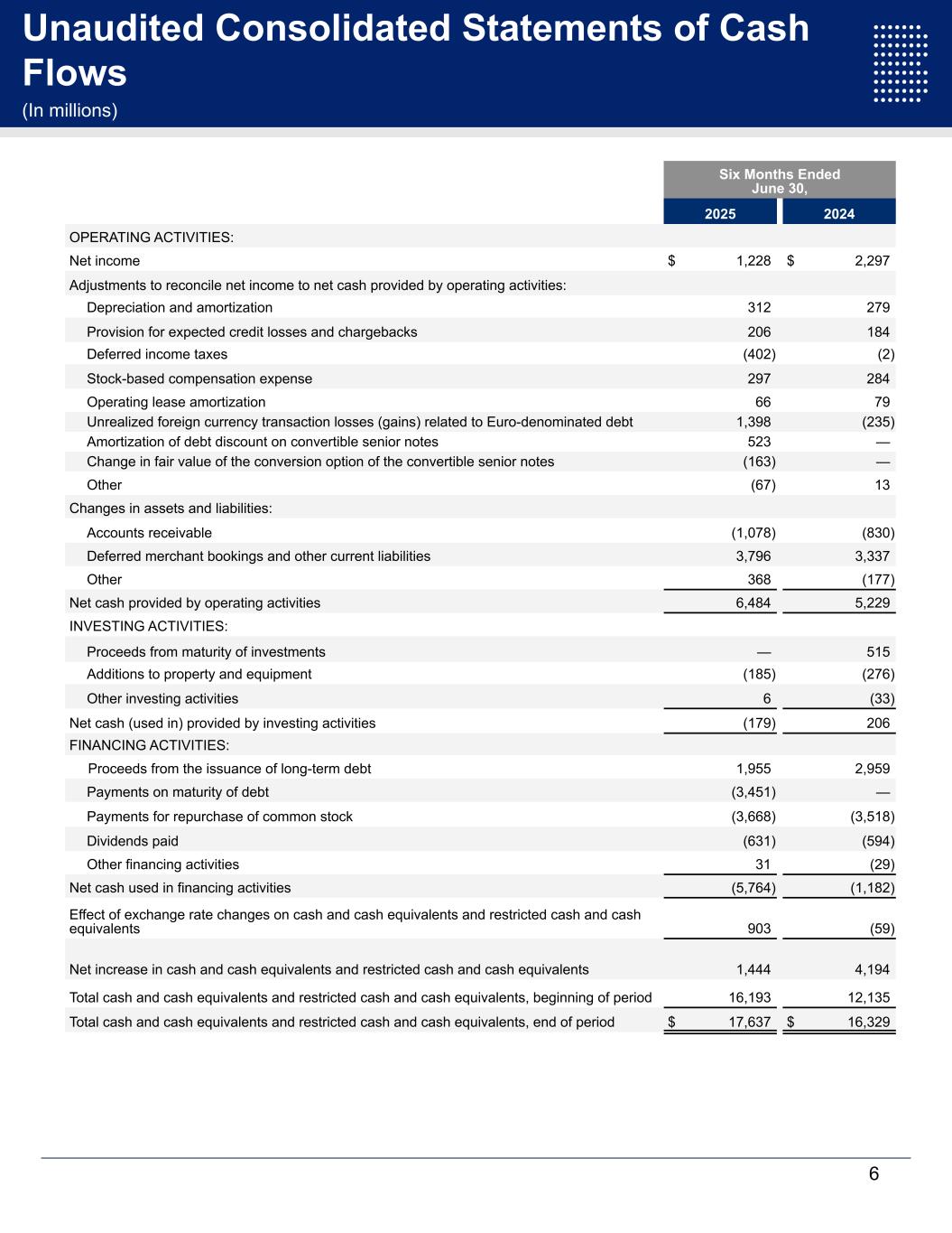 Unaudited Consolidated Statements of Cash Flows (In millions) Six Months Ended June 30, 2025 2024 OPERATING ACTIVITIES: Net income $ 1,228 $ 2,297 Adjustments to reconcile net income to net cash provided by operating activities: Depreciation and amortization 312 279 Provision for expected credit losses and chargebacks 206 184 Deferred income taxes (402) (2) Stock-based compensation expense 297 284 Operating lease amortization 66 79 Unrealized foreign currency transaction losses (gains) related to Euro-denominated debt 1,398 (235) Amortization of debt discount on convertible senior notes 523 — Change in fair value of the conversion option of the convertible senior notes (163) — Other (67) 13 Changes in assets and liabilities: Accounts receivable (1,078) (830) Deferred merchant bookings and other current liabilities 3,796 3,337 Other 368 (177) Net cash provided by operating activities 6,484 5,229 INVESTING ACTIVITIES: Proceeds from maturity of investments — 515 Additions to property and equipment (185) (276) Other investing activities 6 (33) Net cash (used in) provided by investing activities (179) 206 FINANCING ACTIVITIES: Proceeds from the issuance of long-term debt 1,955 2,959 Payments on maturity of debt (3,451) — Payments for repurchase of common stock (3,668) (3,518) Dividends paid (631) (594) Other financing activities 31 (29) Net cash used in financing activities (5,764) (1,182) Effect of exchange rate changes on cash and cash equivalents and restricted cash and cash equivalents 903 (59) Net increase in cash and cash equivalents and restricted cash and cash equivalents 1,444 4,194 Total cash and cash equivalents and restricted cash and cash equivalents, beginning of period 16,193 12,135 Total cash and cash equivalents and restricted cash and cash equivalents, end of period $ 17,637 $ 16,329 6