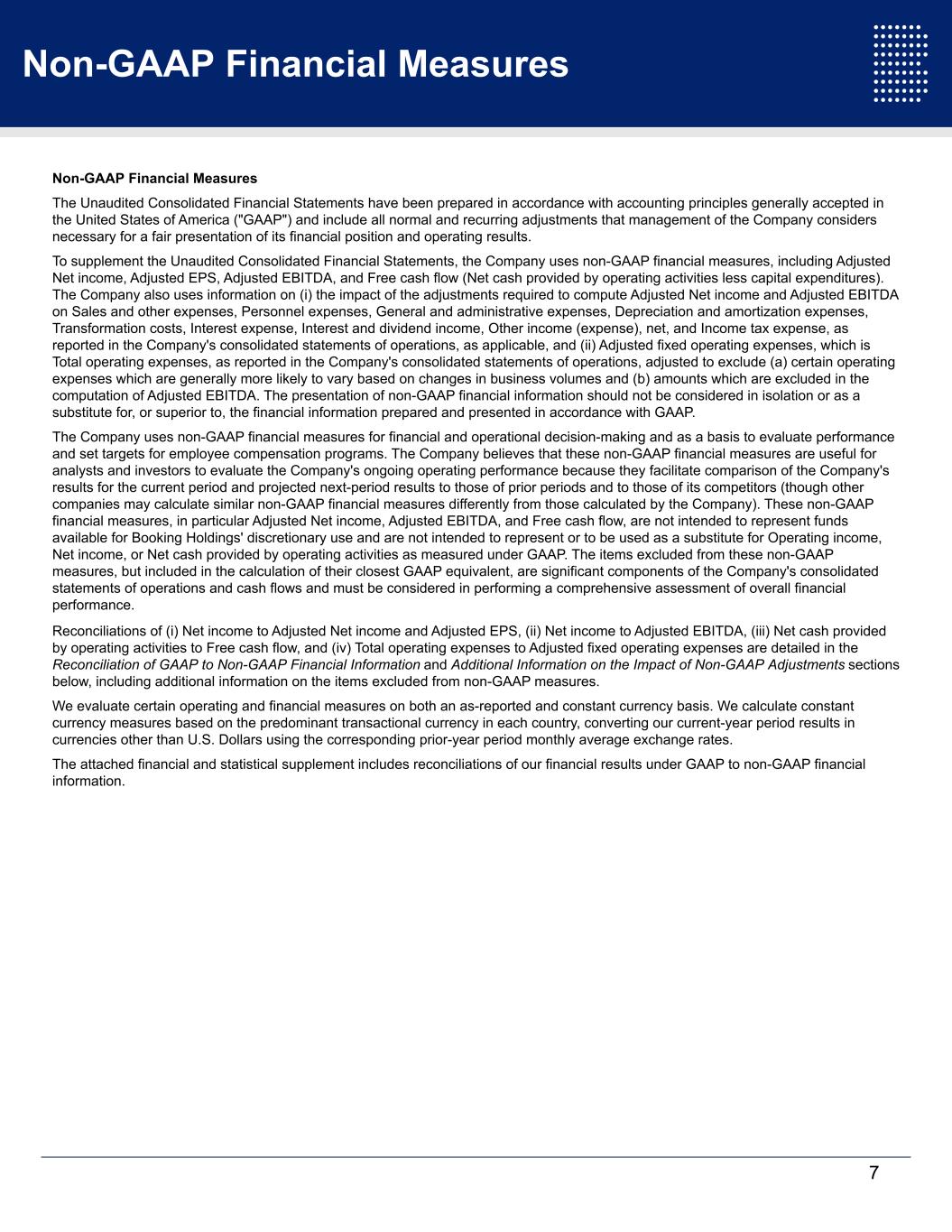 Non-GAAP Financial Measures Non-GAAP Financial Measures The Unaudited Consolidated Financial Statements have been prepared in accordance with accounting principles generally accepted in the United States of America ("GAAP") and include all normal and recurring adjustments that management of the Company considers necessary for a fair presentation of its financial position and operating results. To supplement the Unaudited Consolidated Financial Statements, the Company uses non-GAAP financial measures, including Adjusted Net income, Adjusted EPS, Adjusted EBITDA, and Free cash flow (Net cash provided by operating activities less capital expenditures). The Company also uses information on (i) the impact of the adjustments required to compute Adjusted Net income and Adjusted EBITDA on Sales and other expenses, Personnel expenses, General and administrative expenses, Depreciation and amortization expenses, Transformation costs, Interest expense, Interest and dividend income, Other income (expense), net, and Income tax expense, as reported in the Company's consolidated statements of operations, as applicable, and (ii) Adjusted fixed operating expenses, which is Total operating expenses, as reported in the Company's consolidated statements of operations, adjusted to exclude (a) certain operating expenses which are generally more likely to vary based on changes in business volumes and (b) amounts which are excluded in the computation of Adjusted EBITDA. The presentation of non-GAAP financial information should not be considered in isolation or as a substitute for, or superior to, the financial information prepared and presented in accordance with GAAP. The Company uses non-GAAP financial measures for financial and operational decision-making and as a basis to evaluate performance and set targets for employee compensation programs. The Company believes that these non-GAAP financial measures are useful for analysts and investors to evaluate the Company's ongoing operating performance because they facilitate comparison of the Company's results for the current period and projected next-period results to those of prior periods and to those of its competitors (though other companies may calculate similar non-GAAP financial measures differently from those calculated by the Company). These non-GAAP financial measures, in particular Adjusted Net income, Adjusted EBITDA, and Free cash flow, are not intended to represent funds available for Booking Holdings' discretionary use and are not intended to represent or to be used as a substitute for Operating income, Net income, or Net cash provided by operating activities as measured under GAAP. The items excluded from these non-GAAP measures, but included in the calculation of their closest GAAP equivalent, are significant components of the Company's consolidated statements of operations and cash flows and must be considered in performing a comprehensive assessment of overall financial performance. Reconciliations of (i) Net income to Adjusted Net income and Adjusted EPS, (ii) Net income to Adjusted EBITDA, (iii) Net cash provided by operating activities to Free cash flow, and (iv) Total operating expenses to Adjusted fixed operating expenses are detailed in the Reconciliation of GAAP to Non-GAAP Financial Information and Additional Information on the Impact of Non-GAAP Adjustments sections below, including additional information on the items excluded from non-GAAP measures. We evaluate certain operating and financial measures on both an as-reported and constant currency basis. We calculate constant currency measures based on the predominant transactional currency in each country, converting our current-year period results in currencies other than U.S. Dollars using the corresponding prior-year period monthly average exchange rates. The attached financial and statistical supplement includes reconciliations of our financial results under GAAP to non-GAAP financial information. 7