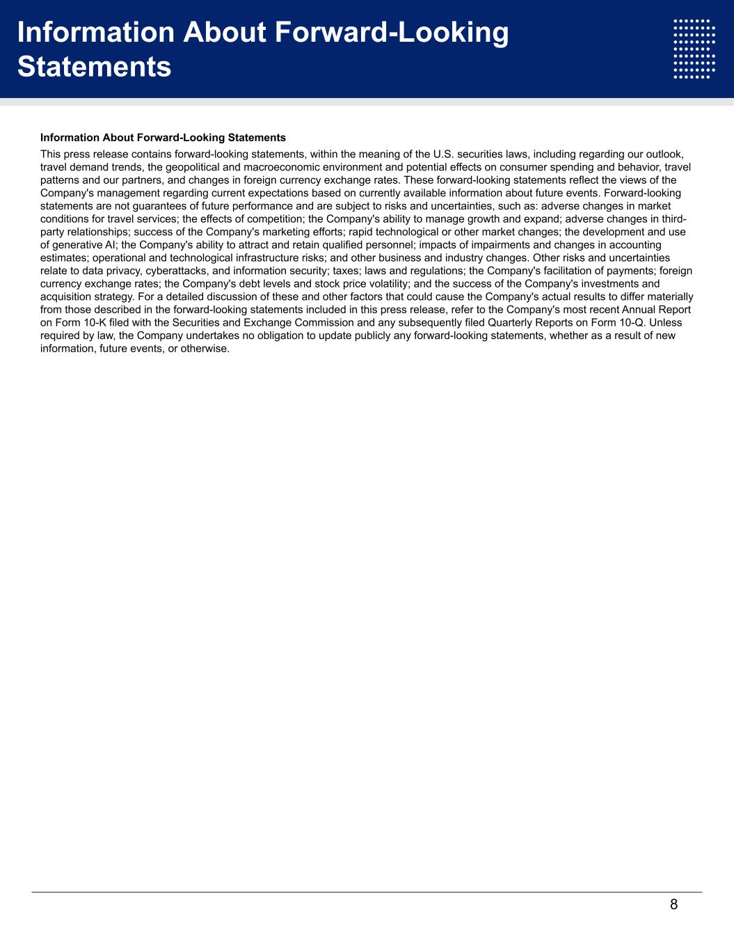 Information About Forward-Looking Statements Information About Forward-Looking Statements This press release contains forward-looking statements, within the meaning of the U.S. securities laws, including regarding our outlook, travel demand trends, the geopolitical and macroeconomic environment and potential effects on consumer spending and behavior, travel patterns and our partners, and changes in foreign currency exchange rates. These forward-looking statements reflect the views of the Company's management regarding current expectations based on currently available information about future events. Forward-looking statements are not guarantees of future performance and are subject to risks and uncertainties, such as: adverse changes in market conditions for travel services; the effects of competition; the Company's ability to manage growth and expand; adverse changes in third- party relationships; success of the Company's marketing efforts; rapid technological or other market changes; the development and use of generative AI; the Company's ability to attract and retain qualified personnel; impacts of impairments and changes in accounting estimates; operational and technological infrastructure risks; and other business and industry changes. Other risks and uncertainties relate to data privacy, cyberattacks, and information security; taxes; laws and regulations; the Company's facilitation of payments; foreign currency exchange rates; the Company's debt levels and stock price volatility; and the success of the Company's investments and acquisition strategy. For a detailed discussion of these and other factors that could cause the Company's actual results to differ materially from those described in the forward-looking statements included in this press release, refer to the Company's most recent Annual Report on Form 10-K filed with the Securities and Exchange Commission and any subsequently filed Quarterly Reports on Form 10-Q. Unless required by law, the Company undertakes no obligation to update publicly any forward-looking statements, whether as a result of new information, future events, or otherwise. 8