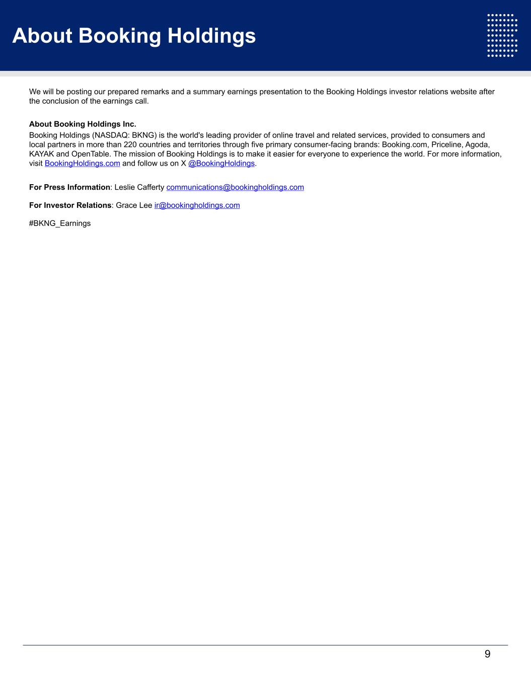 About Booking Holdings We will be posting our prepared remarks and a summary earnings presentation to the Booking Holdings investor relations website after the conclusion of the earnings call. About Booking Holdings Inc. Booking Holdings (NASDAQ: BKNG) is the world's leading provider of online travel and related services, provided to consumers and local partners in more than 220 countries and territories through five primary consumer-facing brands: Booking.com, Priceline, Agoda, KAYAK and OpenTable. The mission of Booking Holdings is to make it easier for everyone to experience the world. For more information, visit BookingHoldings.com and follow us on X @BookingHoldings. For Press Information: Leslie Cafferty communications@bookingholdings.com For Investor Relations: Grace Lee ir@bookingholdings.com #BKNG_Earnings 9