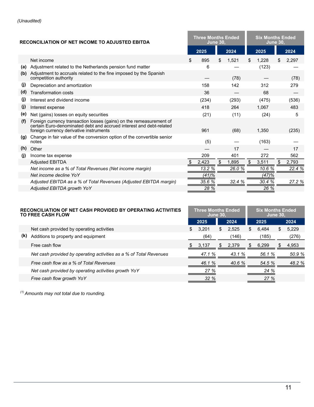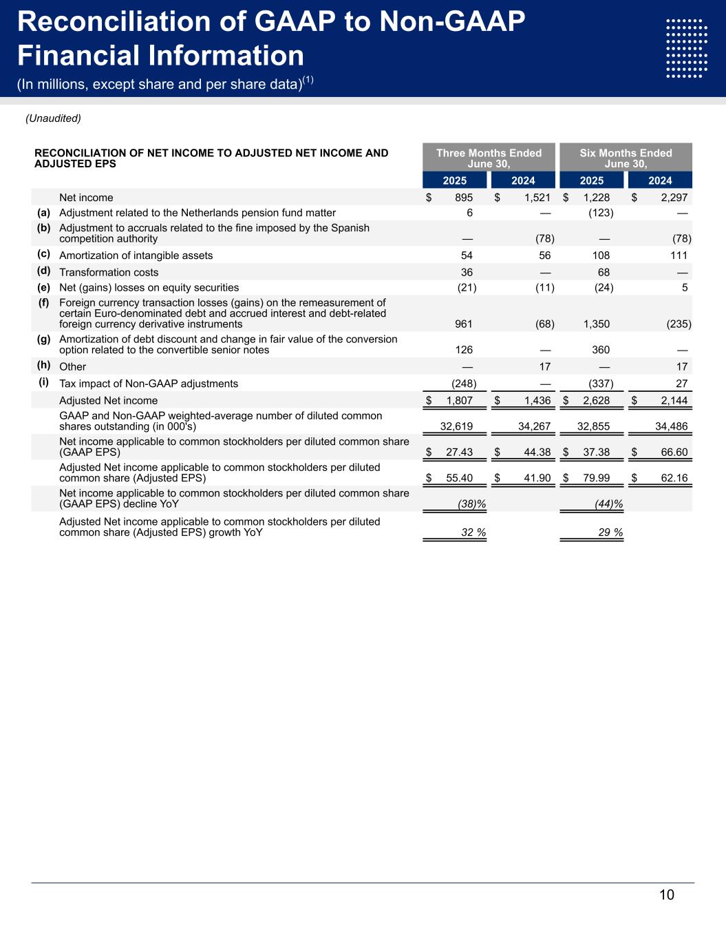 Reconciliation of GAAP to Non-GAAP Financial Information (In millions, except share and per share data)(1) RECONCILIATION OF NET INCOME TO ADJUSTED NET INCOME AND ADJUSTED EPS Three Months Ended June 30, Six Months Ended June 30, 2025 2024 2025 2024 Net income $ 895 $ 1,521 $ 1,228 $ 2,297 (a) Adjustment related to the Netherlands pension fund matter 6 — (123) — (b) Adjustment to accruals related to the fine imposed by the Spanish competition authority — (78) — (78) (c) Amortization of intangible assets 54 56 108 111 (d) Transformation costs 36 — 68 — (e) Net (gains) losses on equity securities (21) (11) (24) 5 (f) Foreign currency transaction losses (gains) on the remeasurement of certain Euro-denominated debt and accrued interest and debt-related foreign currency derivative instruments 961 (68) 1,350 (235) (g) Amortization of debt discount and change in fair value of the conversion option related to the convertible senior notes 126 — 360 — (h) Other — 17 — 17 (i) Tax impact of Non-GAAP adjustments (248) — (337) 27 Adjusted Net income $ 1,807 $ 1,436 $ 2,628 $ 2,144 GAAP and Non-GAAP weighted-average number of diluted common shares outstanding (in 000's) 32,619 34,267 32,855 34,486 Net income applicable to common stockholders per diluted common share (GAAP EPS) $ 27.43 $ 44.38 $ 37.38 $ 66.60 Adjusted Net income applicable to common stockholders per diluted common share (Adjusted EPS) $ 55.40 $ 41.90 $ 79.99 $ 62.16 Net income applicable to common stockholders per diluted common share (GAAP EPS) decline YoY (38) % (44) % Adjusted Net income applicable to common stockholders per diluted common share (Adjusted EPS) growth YoY 32 % 29 % 10 (Unaudited)
