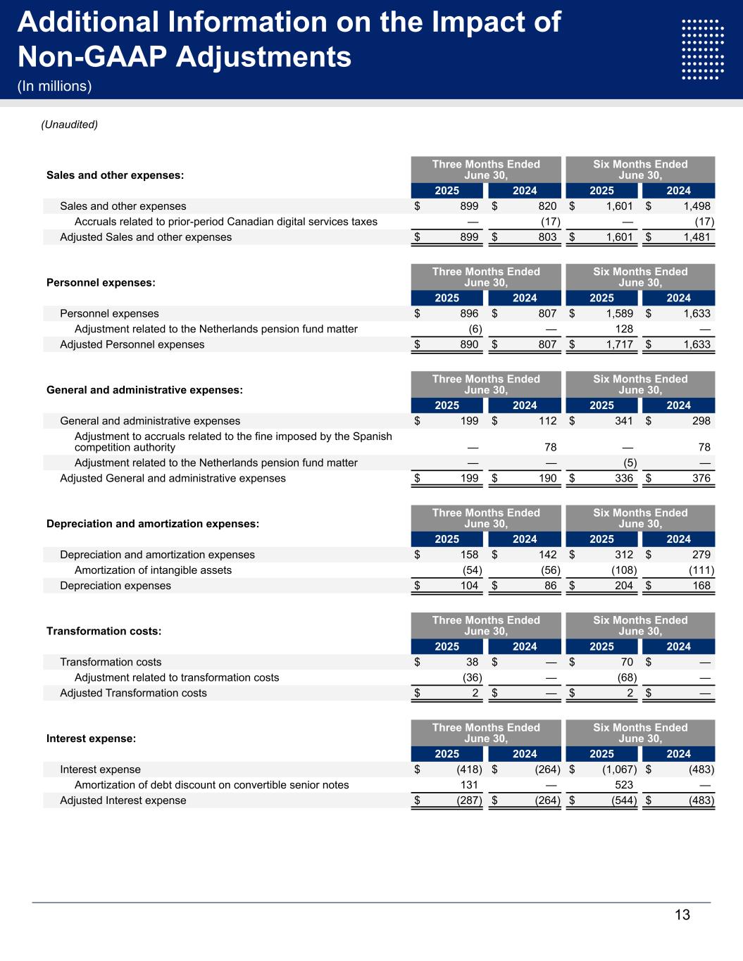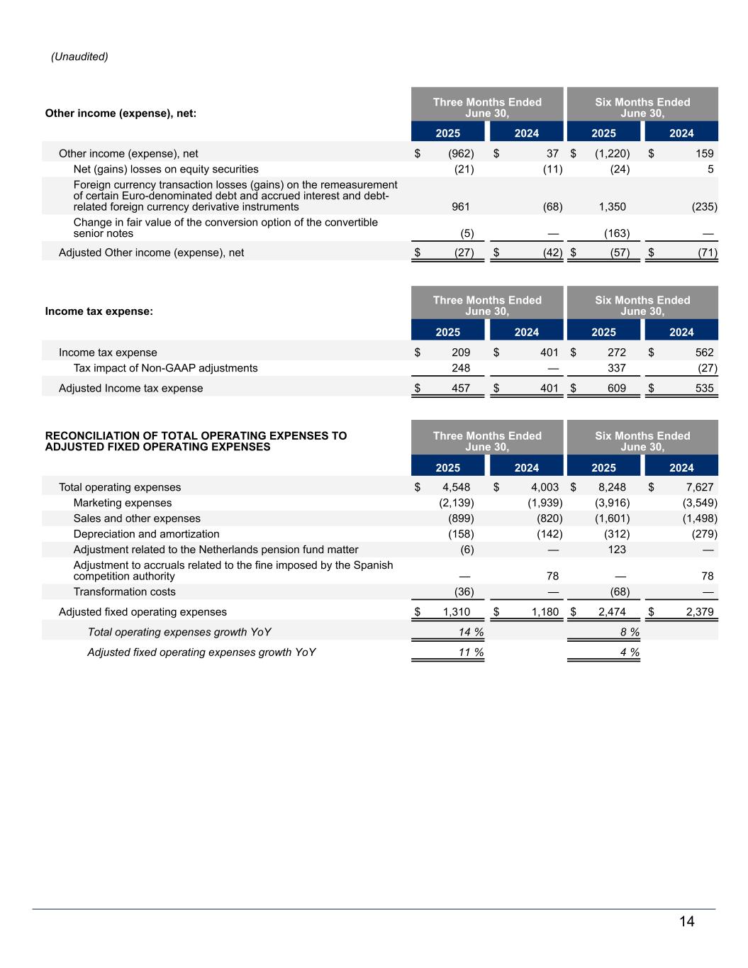 Additional Information on the Impact of Non-GAAP Adjustments (In millions) Sales and other expenses: Three Months Ended June 30, Six Months Ended June 30, 2025 2024 2025 2024 Sales and other expenses $ 899 $ 820 $ 1,601 $ 1,498 Accruals related to prior-period Canadian digital services taxes — (17) — (17) Adjusted Sales and other expenses $ 899 $ 803 $ 1,601 $ 1,481 Personnel expenses: Three Months Ended June 30, Six Months Ended June 30, 2025 2024 2025 2024 Personnel expenses $ 896 $ 807 $ 1,589 $ 1,633 Adjustment related to the Netherlands pension fund matter (6) — 128 — Adjusted Personnel expenses $ 890 $ 807 $ 1,717 $ 1,633 General and administrative expenses: Three Months Ended June 30, Six Months Ended June 30, 2025 2024 2025 2024 General and administrative expenses $ 199 $ 112 $ 341 $ 298 Adjustment to accruals related to the fine imposed by the Spanish competition authority — 78 — 78 Adjustment related to the Netherlands pension fund matter — — (5) — Adjusted General and administrative expenses $ 199 $ 190 $ 336 $ 376 Depreciation and amortization expenses: Three Months Ended June 30, Six Months Ended June 30, 2025 2024 2025 2024 Depreciation and amortization expenses $ 158 $ 142 $ 312 $ 279 Amortization of intangible assets (54) (56) (108) (111) Depreciation expenses $ 104 $ 86 $ 204 $ 168 Transformation costs: Three Months Ended June 30, Six Months Ended June 30, 2025 2024 2025 2024 Transformation costs $ 38 $ — $ 70 $ — Adjustment related to transformation costs (36) — (68) — Adjusted Transformation costs $ 2 $ — $ 2 $ — Interest expense: Three Months Ended June 30, Six Months Ended June 30, 2025 2024 2025 2024 Interest expense $ (418) $ (264) $ (1,067) $ (483) Amortization of debt discount on convertible senior notes 131 — 523 — Adjusted Interest expense $ (287) $ (264) $ (544) $ (483) 13 (Unaudited)