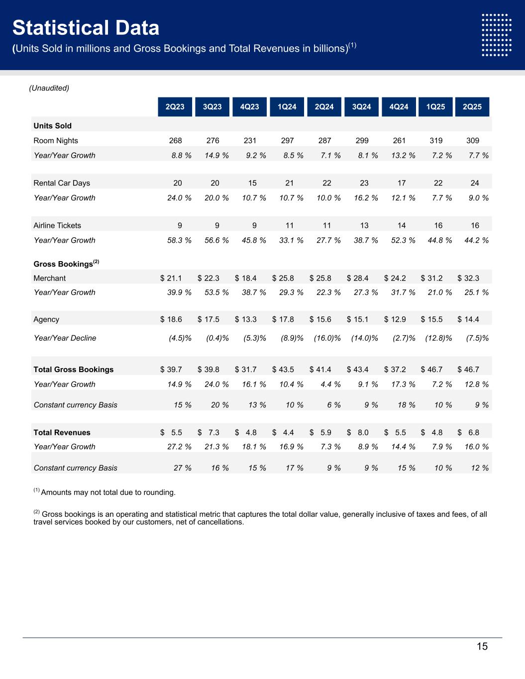 Statistical Data (Units Sold in millions and Gross Bookings and Total Revenues in billions)(1) 2Q23 3Q23 4Q23 1Q24 2Q24 3Q24 4Q24 1Q25 2Q25 Units Sold Room Nights 268 276 231 297 287 299 261 319 309 Year/Year Growth 8.8 % 14.9 % 9.2 % 8.5 % 7.1 % 8.1 % 13.2 % 7.2 % 7.7 % Rental Car Days 20 20 15 21 22 23 17 22 24 Year/Year Growth 24.0 % 20.0 % 10.7 % 10.7 % 10.0 % 16.2 % 12.1 % 7.7 % 9.0 % Airline Tickets 9 9 9 11 11 13 14 16 16 Year/Year Growth 58.3 % 56.6 % 45.8 % 33.1 % 27.7 % 38.7 % 52.3 % 44.8 % 44.2 % Gross Bookings(2) Merchant $ 21.1 $ 22.3 $ 18.4 $ 25.8 $ 25.8 $ 28.4 $ 24.2 $ 31.2 $ 32.3 Year/Year Growth 39.9 % 53.5 % 38.7 % 29.3 % 22.3 % 27.3 % 31.7 % 21.0 % 25.1 % Agency $ 18.6 $ 17.5 $ 13.3 $ 17.8 $ 15.6 $ 15.1 $ 12.9 $ 15.5 $ 14.4 Year/Year Decline (4.5) % (0.4) % (5.3) % (8.9) % (16.0) % (14.0) % (2.7) % (12.8) % (7.5) % Total Gross Bookings $ 39.7 $ 39.8 $ 31.7 $ 43.5 $ 41.4 $ 43.4 $ 37.2 $ 46.7 $ 46.7 Year/Year Growth 14.9 % 24.0 % 16.1 % 10.4 % 4.4 % 9.1 % 17.3 % 7.2 % 12.8 % Constant currency Basis 15 % 20 % 13 % 10 % 6 % 9 % 18 % 10 % 9 % Total Revenues $ 5.5 $ 7.3 $ 4.8 $ 4.4 $ 5.9 $ 8.0 $ 5.5 $ 4.8 $ 6.8 Year/Year Growth 27.2 % 21.3 % 18.1 % 16.9 % 7.3 % 8.9 % 14.4 % 7.9 % 16.0 % Constant currency Basis 27 % 16 % 15 % 17 % 9 % 9 % 15 % 10 % 12 % (1) Amounts may not total due to rounding. (2) Gross bookings is an operating and statistical metric that captures the total dollar value, generally inclusive of taxes and fees, of all travel services booked by our customers, net of cancellations. 15 (Unaudited)