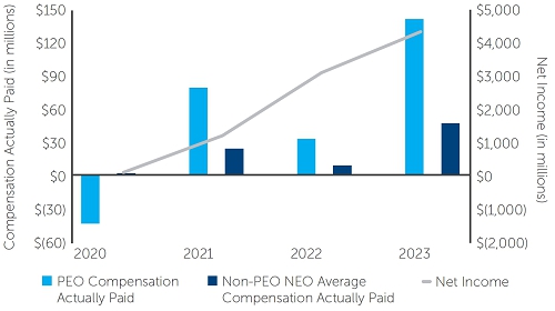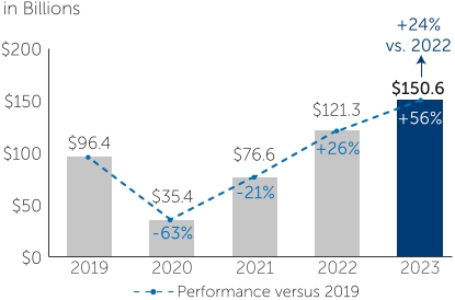In 2023, we achieved record-setting financial results, with more than $21 billion in revenue, which was up 25% compared to the year prior, more than $4 billion in net income, which was up 40% from the prior year, more than $7 billion in adjusted EBITDA, which was up 34% compared to the prior year, and generated $7 billion in net cash provided by operating activities and free cash flow. With this solid financial performance and our strong balance sheet, we were able to return over $10 billion to shareholders over the course of the year through stock repurchases, and we recently paid our first cash dividend. (See Appendix A for a reconciliation of non-GAAP financial measures to GAAP financial measures.)