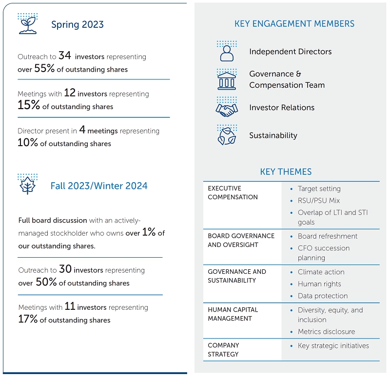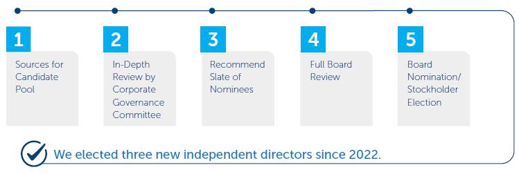 | Election of twelve directors | Advisory vote to approve 2023 named executive officer compensation | Ratification of the appointment of the independent registered public accounting firm | Non-binding stockholder proposals, if properly presented | |||||||||||||||