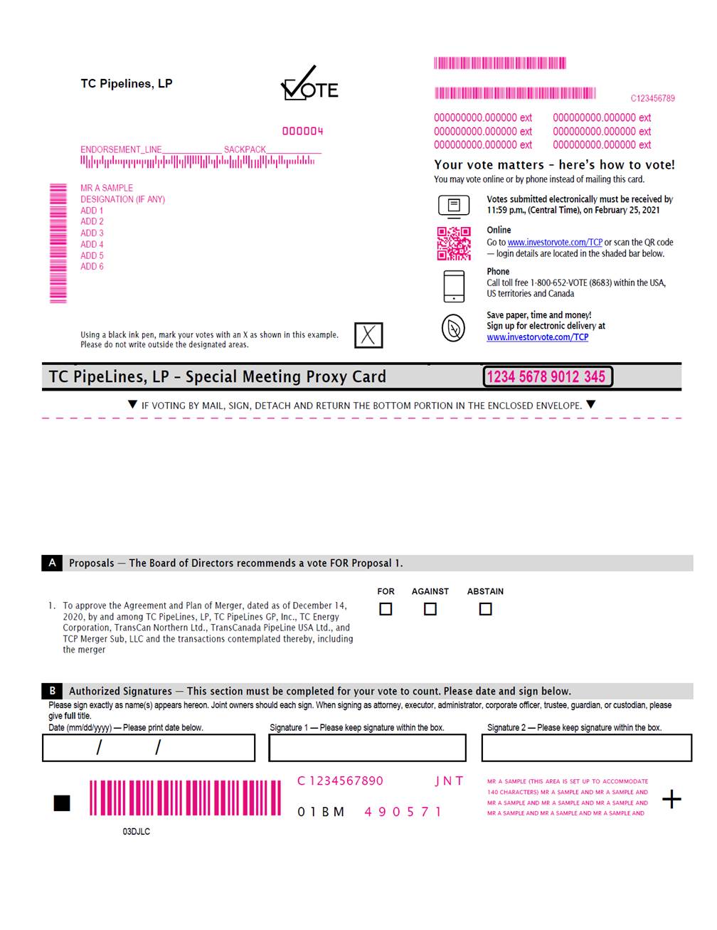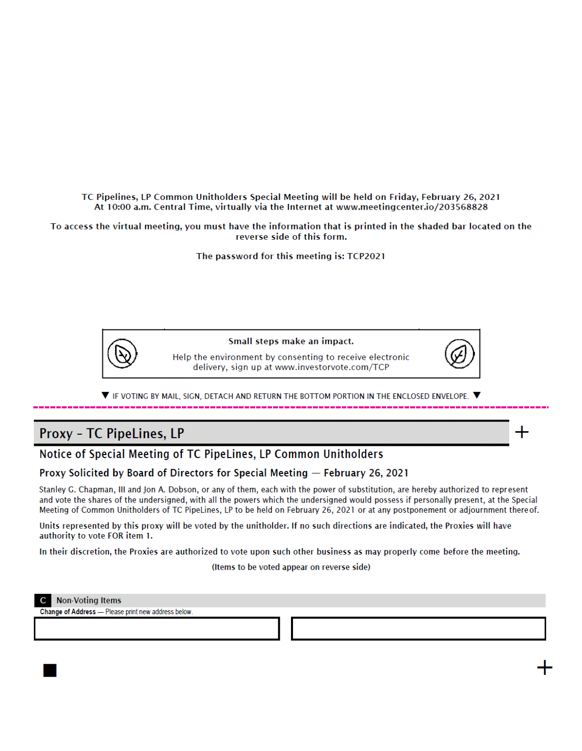 TC Pipelines, LP Common Unitholders Special Meeting will be held on Friday, February 26, 2021 At 10:00 a.m. Central Time, virtually via the Internet at www.meeting center.io/203568828 To access the virtual meeting, you must have the information that is printed in the shaded bar located on the reverse side of this form. The password for this meeting is: TCP2021 IF VOTING BY MAIL, SIGN, DETACH AND RETURN THE BOTTOM PORTION IN THE ENCLOSED ENVELOPE. + Proxy – TC PipeLines, LP Notice of Special Meeting of TC PipeLines, LP Common Unitholders Proxy Solicited by Board of Directors for Special Meeting — February 26, 2021 Stanley G. Chapman, III and Jon A. Dobson, or any of them, each with the power of substitution, are hereby authorized to represent and vote the shares of the undersigned, with all the powers which the undersigned would possess if personally present, at the Special Meeting of Common Unitholders of TC PipeLines, LP to be held on February 26, 2021 or at any postponement or adjournment thereof. Units represented by this proxy will be voted by the unitholder. If no such directions are indicated, the Proxies will have authority to vote FOR item 1. In their discretion, the Proxies are authorized to vote upon such other business as may properly come before the meeting. (Items to be voted appear on reverse side) Change of Address — Please print new address below. + C Non-Voting Items Small steps make an impact. Help the environment by consenting to receive electronic delivery, sign up at www.investorvote.com/TCP