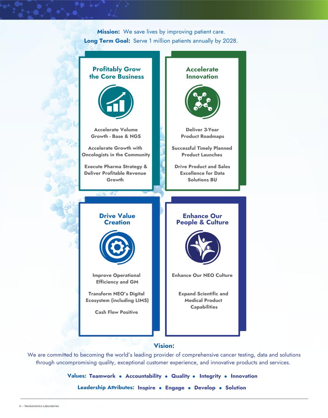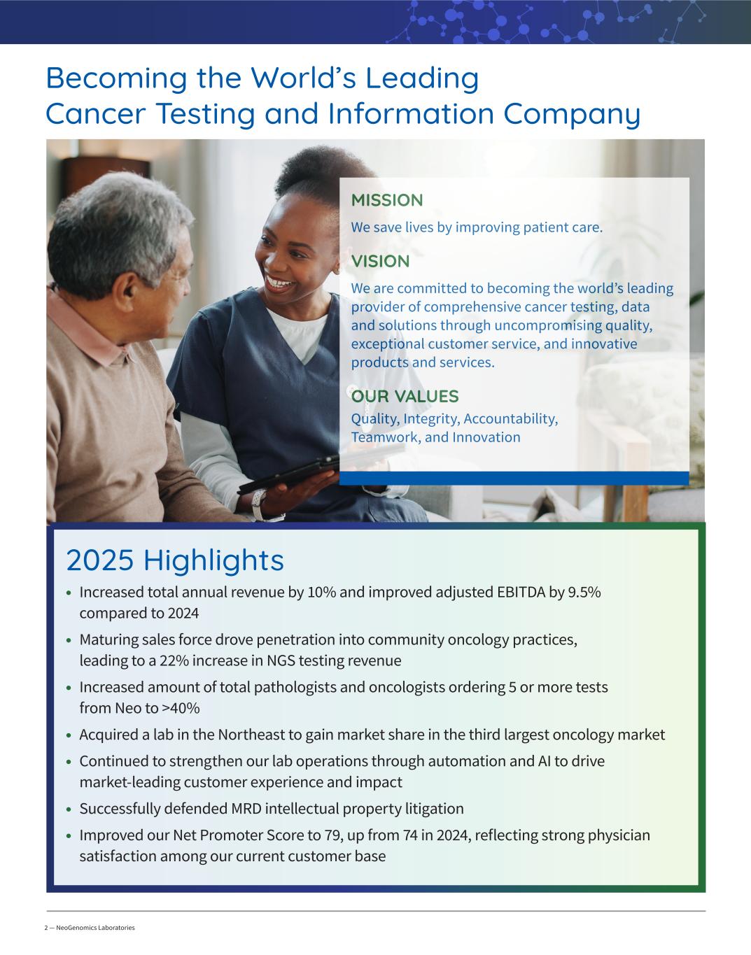 4 — NeoGenomics Laboratories Having now served as CEO of NeoGenomics for one full year, it is my honor to take this opportunity to recap our recent progress and outline my vision for the future. I am pleased with the financial and operational progress that we achieved in 2025 and am incredibly optimistic about the significant opportunities that remain in front of us. Our goal remains unchanged: to be a leading provider of diagnostic testing solutions, with a singular focus on oncology. With a broad menu of more than 500 tests, including the latest innovations in therapy selection and molecular residual disease (MRD), I believe we are very well positioned to compete and win in this complex industry while helping to optimize outcomes for countless patients as they advance along their cancer care journey. Our mission, broadly stated, is to save lives by improving patient care. It is what drives us every day. Winning in the Community Setting A key differentiator for our company is our passion for meeting the needs of oncologists and pathologists in the community setting, where approximately 80% of cancer patients choose to receive their care. How are we winning against both specialty oncology labs and large reference labs? We believe community oncologists are guideline-driven and focused on certainty, not possibility, as with large academic medical centers. Community providers choose partners that remove friction and enable confident treatment decisions under operational, economic and time constraints. To that end, we offer ease of ordering, simple to interpret test reports, fast and consistent test turnaround times, access to medical expertise, and most importantly, a very comprehensive test menu. We also enjoy a leadership position in the hematology testing market, with greater than 25% share across diagnostics and therapy selection. And as pathologists and oncologists consolidate the number of labs they use, we are successfully leveraging this heme leadership position to create enhanced test demand, particularly in therapy selection and MRD. In fact, in 2025 we saw 14% growth in the total number of pathologists and oncologists ordering five or more tests from Neo, including 75% of community oncologists who were new to Neo last year – a strong leading indicator. In addition, we estimate that approximately 40% of all active pathologists and oncologists ordered five or more of our tests during the year. And while we are proud of this progress, we also recognize that more than half of all active pathologists and oncologists are still available to us to drive future growth. To tap into this significant opportunity, we are making measured investments in what I consider to be a world-class commercial organization. In late 2024 and early 2025, we added 35 oncology sales specialists (OSSs) to target community oncologists, and as these individuals matured into their roles, we saw a continued uptake of our advanced tests. This year, we will continue to opportunistically add resources where we think they can make a meaningful impact on our reach, including an additional 25 OSSs by the third quarter. Therapy Selection and MRD: Innovation in a $30 Billion Combined Addressable Market We are focusing our R&D efforts on technologies that address emerging clinical needs, and this allows us to bring the latest innovations, which have historically been the purview of NCI-designated cancer centers, to community providers. In 2025, we significantly strengthened our offerings in therapy selection and MRD, which together represent a combined addressable market in excess of $30 billion. The therapy selection market is greater than $13 billion, growing approximately 15% annually, and just 35% penetrated by our estimates. Our PanTracer family of therapy selection assays, including PanTracer Tissue and our recently introduced PanTracer LBx (liquid biopsy), can be ordered individually or concurrently for maximum insight based on the patient’s unique needs. Further, the introduction of PanTracer Pro this past February rounds out the portfolio. PanTracer Pro streamlines the ordering and testing process, delivering timely, relevant results, helping clinicians personalize treatment strategies and improve patient outcomes. Dear NeoGenomics Shareholders