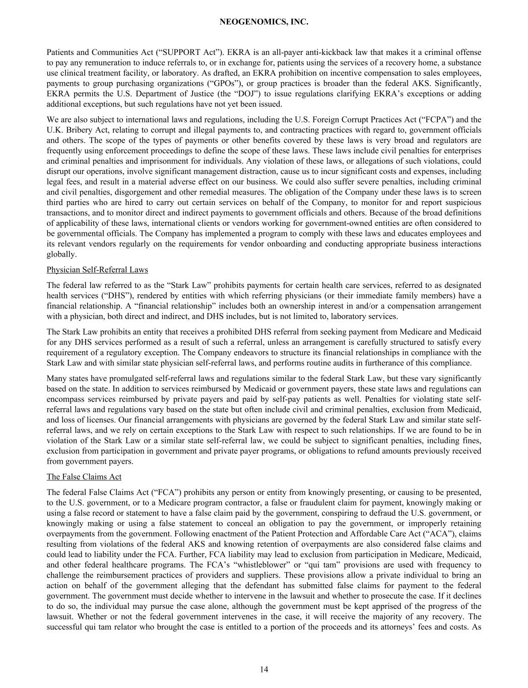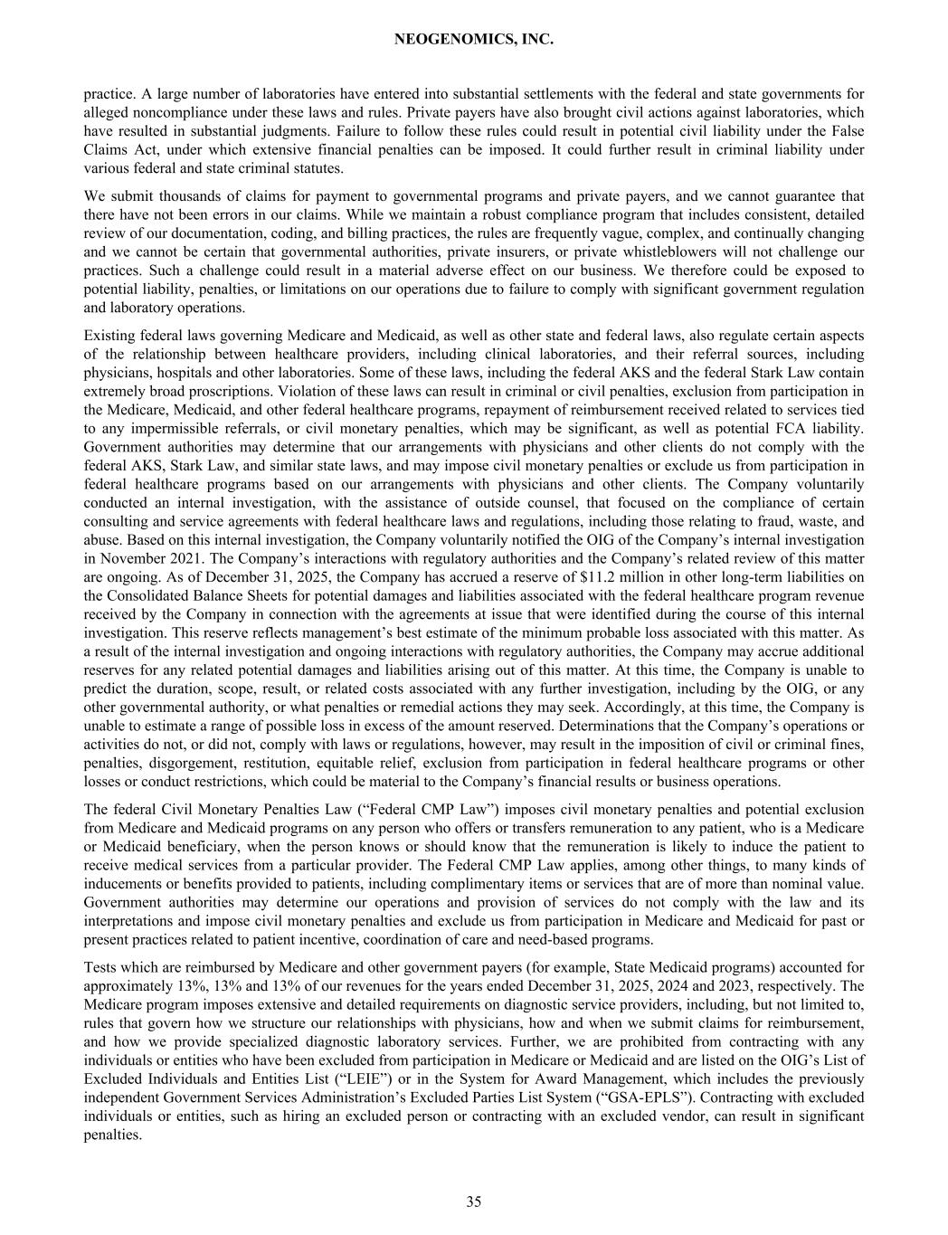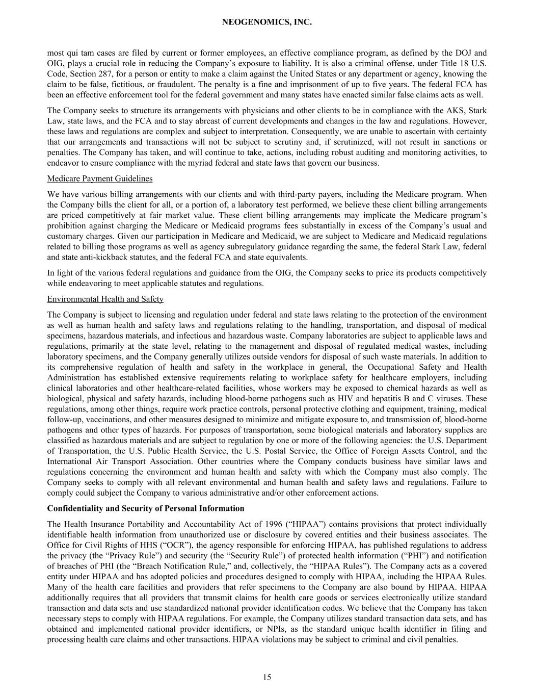 clinical laboratory services, if the physician or an immediate family member of the physician has an applicable financial relationship with the entity providing the designated health services; • the federal False Claims Act (FCA), which, among other things, imposes liability on any person or entity that, among other things, knowingly presents, or causes to be presented, a false or fraudulent claim for payment to, or improperly retaining overpayments from, the federal government; • the federal Civil Monetary Penalties Law, which prohibits, among other things, the offering or transfer of remuneration to a Medicare or Medicaid beneficiary if the person knows or should know it is likely to influence the beneficiary’s selection of a particular provider, practitioner, or supplier of services reimbursable by Medicare or Medicaid, unless an exception applies; • the Health Insurance Portability and Accountability Act of 1996 (HIPAA) fraud and abuse provisions, which created federal criminal statutes that prohibit, among other things, knowingly and willfully executing, or attempting to execute, a scheme to defraud any healthcare benefit program, including private insurers, knowingly and willfully embezzling or stealing from a healthcare benefit program, willfully obstructing a criminal investigation of a healthcare offense, and knowingly and willfully falsifying, concealing or covering up a material fact or making any materially false, fictitious or fraudulent statement in connection with the delivery of or payment for healthcare benefits, items or services; and • other federal and state fraud and abuse laws, such as anti-kickback laws, prohibitions on self-referral and fee- splitting, and false claims acts, which may extend to services reimbursable by any third-party payer, including private insurers. Of particular importance to our operations is ensuring compliance with federal and state laws prohibiting fraudulent billing and the retention of overpayments. In particular, if we fail to comply with federal and state documentation, coding, and billing rules, we could be subject to liability under the federal FCA, including civil penalties, loss of licenses, and exclusion from the Medicare and Medicaid programs. If an entity is determined to have violated the federal FCA, it may be required to pay up to three times the actual damages sustained by the government, plus substantial civil penalties for each separate false claim. Further, FCA liability may lead to exclusion from participation in Medicare, Medicaid, and other federal healthcare programs. There are a number of potential bases for liability under the federal FCA. For example, liability arises when an entity knowingly submits, or causes another to submit, a claim for reimbursement to the federal government for a service which was not provided or which did not qualify for reimbursement. Submitting a claim with reckless disregard or deliberate ignorance of its truth or falsity could also result in liability under the FCA. Following enactment of the ACA, knowing retention of overpayments is also considered a false claim and could lead to liability under the FCA. The FCA’s “whistleblower” or “qui tam” provisions are used with frequency to challenge the reimbursement practices of providers and suppliers. Those provisions allow a private individual to bring an action on behalf of the government alleging that the defendant has submitted false claims for payment to the government. The government must decide whether to intervene in the lawsuit and whether to prosecute the case. If it declines to do so, the individual may pursue the case alone, although the government must be kept apprised of the progress of the lawsuit. Whether or not the federal government intervenes in the case, it will receive the majority of any recovery. The successful qui tam relator who brought the case is entitled to a portion of the proceeds and his or her attorneys’ fees and costs. In addition, various states have enacted laws modeled after the federal FCA, which prohibit submitting false claims for payment to the state, or, in some states, to commercial payers. If we fail to comply with federal and state documentation, coding, and billing rules, we could be subject to liability under analogous state laws as well as criminal liability through a variety of federal and state criminal statutes. The U.S. Department of Justice (“DOJ”), Office of Inspector General of the Department of Health and Human Services (“OIG”), and other government agencies have increased scrutiny of the healthcare industry in recent years and have investigated and commenced, civil and criminal litigation against healthcare companies related to financial arrangements with healthcare providers, regulatory compliance, product promotional practices, and documentation, coding and billing practices. Government investigations of clinical laboratories have been ongoing for a number of years and are expected to continue in the future. Governmental enforcement action or qui tam civil litigation against us may result in material costs and occupy significant management resources, even if we ultimately prevail. In addition, governmental enforcement action may result in substantial fines, penalties or administrative remedies, including exclusion from government reimbursement programs and entry into corporate integrity agreements with governmental agencies, which could entail significant obligations and costs. When we submit bills for our services to third-party payers, we must follow complex documentation, coding, and billing rules which are based on federal and state laws, rules and regulations, various government publications, and on industry NEOGENOMICS, INC. 34