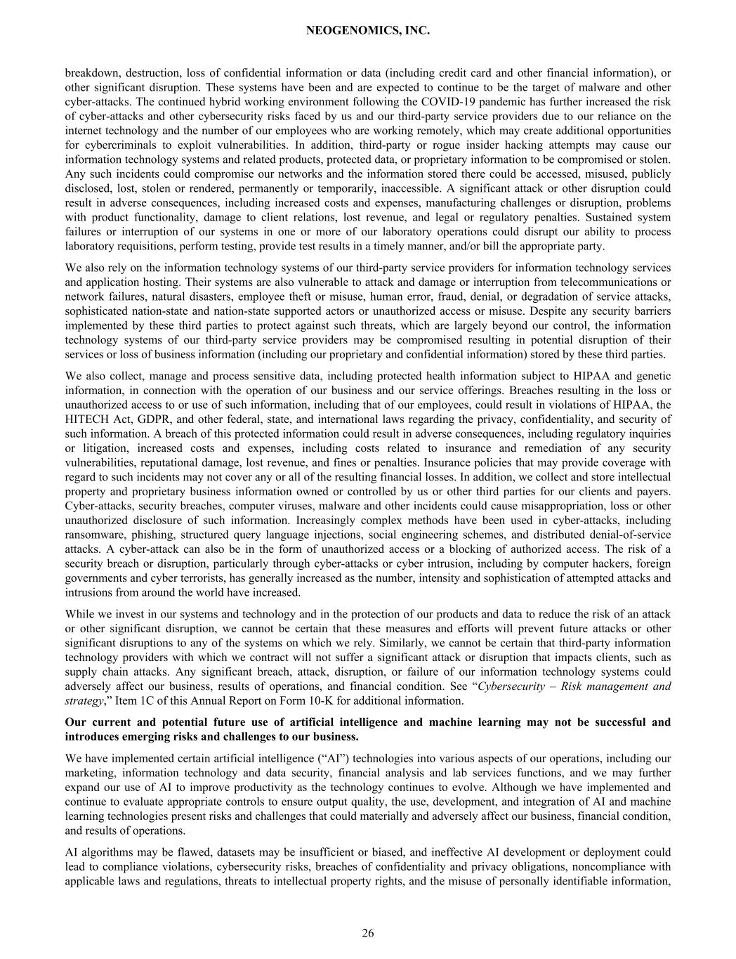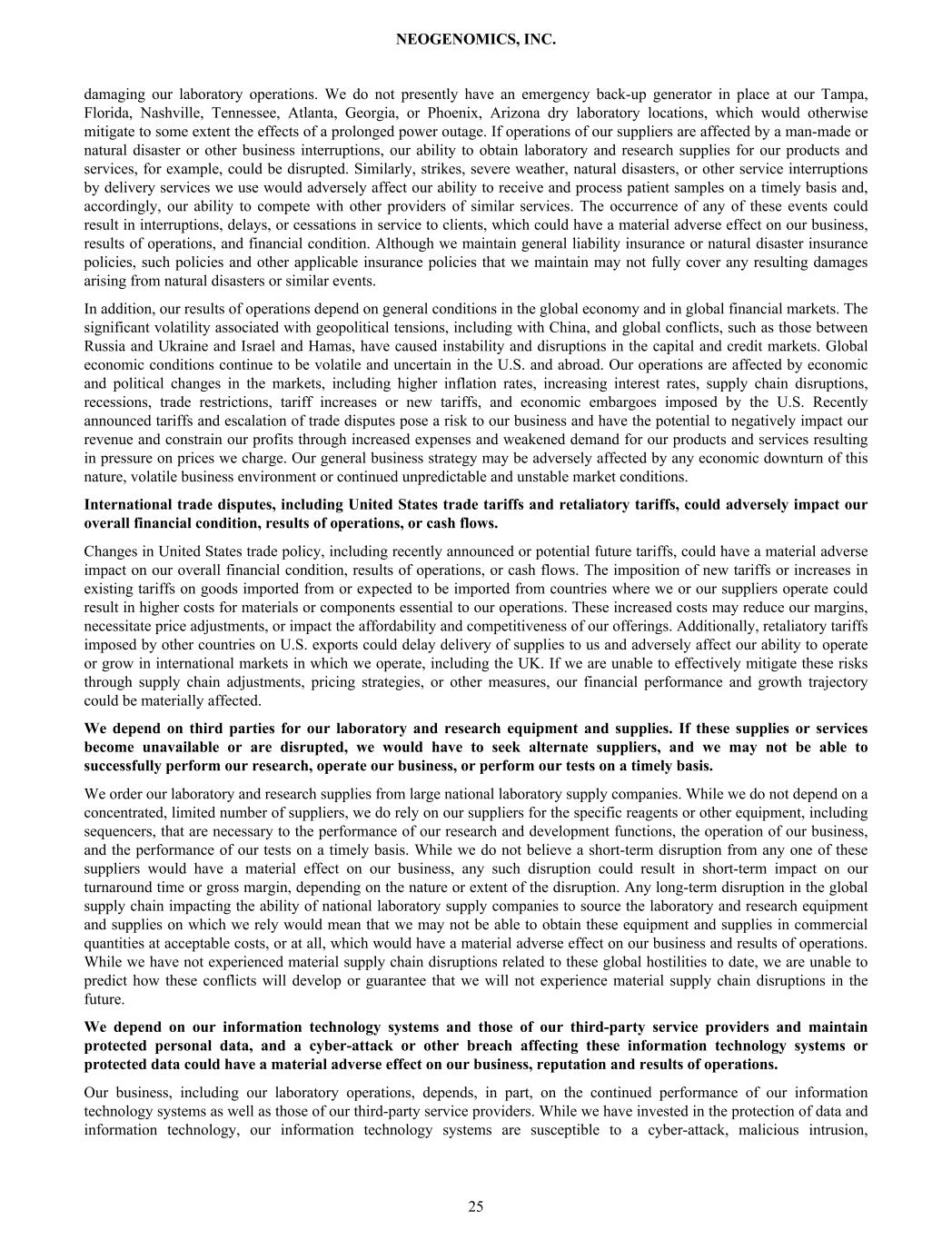 ITEM 1A. RISK FACTORS We are subject to various risks that may materially harm our business, financial condition, and results of operations. They are not, however, the only risks we face. Additional risks and uncertainties not presently known to us or that we currently believe not to be material may also adversely affect our business, financial condition, or results of operations. An investor should carefully consider the risks and uncertainties described below and the other information in this filing before deciding to purchase our common stock. If any of these risks or uncertainties actually occurs, our business, financial condition, or operating results could be materially harmed. In that case, the trading price of our common stock could decline or we may be forced to cease operations. Risk Factors Summary The following is a summary of the material risks that could adversely affect our business, financial condition or results of operations. Risks Relating to Our Business and Operations • We are dependent on key personnel and need to hire additional qualified personnel in order for our business to succeed. • If we are unable to keep pace with the rapid scientific and technological change characteristic to our industry, or to develop, or acquire licenses for, new or improved testing technologies, our competitive position, business, results of operations, and financial condition could be harmed. • We face the risk of capacity constraints, which could have a material adverse effect on our business, results of operations, and financial condition. • Increased competition, including price competition, could have a material adverse impact on our net revenues and profitability. • We expect to make significant investments in the development of new genetic tests and other future products. New product development and commercialization involve a lengthy and complex process and we may be unable to develop or commercialize new products on a timely basis, or at all. • Ethical, legal and social concerns related to the use of genetic information could reduce demand for our tests. • The potential loss or delay of our material client contracts or of multiple contracts could adversely affect our results. • We may become involved in litigation, and our insurance may not sufficiently cover all claims brought against us, which will increase our expenses and may adversely affect our business and results of operations. • We may be unable to obtain, maintain or enforce our intellectual property rights and may be subject to intellectual property litigation that could adversely impact our business. • Our provision of laboratory testing and related services in support of sponsor-led clinical trials and research studies may expose us to contractual, operational, regulatory, or reputational risks, including risks related to data integrity, turnaround times, and compliance with applicable quality standards. • Other manufacturers may discontinue or recall testing products used in our business. • We depend substantially upon third parties for payment of services, which reliance could have a material adverse effect on our cash flows and results of operations. • Business disruptions, including due to natural disasters, power loss, break-ins, global conflicts, political unrest, or unstable economic and market conditions, could have a material adverse effect on our business, results of operations, financial condition, and stock price. • We depend on information technology systems and maintain protected personal data, and a cyber-attack or other breach affecting these information technology systems or protected data could have a material adverse effect on our results of operations. • Performance issues, service interruptions, or price increases by our shipping carriers could adversely affect our business, results of operations, and financial condition, and harm our reputation and ability to provide our specialized clinical services on a timely basis. • We use biological and hazardous materials that require considerable expertise and expense for handling, storage, or disposal and may result in claims against us. • If we are unable to successfully manage the implementation of our Laboratory Information Management System (“LIMS”), our business and results of operations may be adversely affected. Risks Related to Our Common Stock and Indebtedness NEOGENOMICS, INC. 18