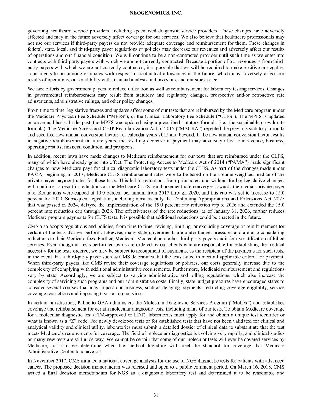 necessary, and covered nationally when performed in a CLIA-certified laboratory, ordered by a treating physician, and all of the following requirements are met: (a) the patient has either recurrent, relapsed, refractory, metastatic, or advanced stages III or IV cancer; (b) the patient has either not been previously tested using the same NGS test for the same primary diagnosis of cancer or has had repeat testing using the same NGS test only when a new primary cancer diagnosis is made by the treating physician; and (c) the patient has decided to seek further cancer treatment (e.g., therapeutic chemotherapy). CMS also determined that the diagnostic laboratory test using NGS must have: FDA approval or clearance as a companion in vitro diagnostic; an FDA approved or cleared indication for use in that patient’s cancer; and results provided to the treating physician for management of the patient using a report template to specify treatment options. On January 27, 2020 CMS issued a final decision memorandum expanding coverage of a FDA approved or cleared NGS test when performed in a CLIA-certified laboratory, ordered by a treating physician, and all of the following requirements are met (a) the patient has ovarian or breast cancer; (b) the patient has clinical indications for germline (inherited) testing ; (c) the patient has a risk factor for germline (inherited) breast or ovarian cancer; and (d) the patient has not been previously tested with the same germline test using NGS for the same germline genetic content. In addition, the CMS final decision memo provides that Medicare Administrative Contractors may determine coverage of NGS tests when performed in a CLIA-certified laboratory, ordered by a treating physician, and all of the following requirements are met: (a) the patient has any cancer diagnosis; (b) the patient has a clinical indication for germline (inherited) testing of hereditary cancers; (c) the patient has a risk fact for germline (inherited) cancer; and (d) the patient not been previously tested with the same germline test using NGS for the same germline genetic content. These CMS changes to reimbursement for NGS testing could directly affect our revenue for these test types. In recent years, Medicare has encouraged beneficiaries to participate in managed care programs, known as “Medicare Advantage” programs, and has encouraged beneficiaries from the traditional fee-for-service Medicare program to switch to Medicare Advantage programs. This has resulted in rapid growth of health insurance and managed care plans offering Medicare Advantage programs and growth in Medicare beneficiary enrollment in these programs. Also, in recent years, many states have increasingly mandated that Medicaid beneficiaries enroll in managed care arrangements. If these efforts continue to be successful, we may experience a further shift of traditional Medicare and Medicaid fee-for-service beneficiaries to managed care programs. As a result, we would be required to contract with those private managed care programs in order to be reimbursed for services provided to their Medicare and Medicaid members. We cannot be certain that we will be successful in entering into agreements with these managed care programs at rates of payment similar to those we realize from our non-managed care lines of business. We expect the initiatives such as those described above to continue and, if they do, to reduce reimbursements for clinical laboratory services, to impose more stringent cost controls on clinical laboratory services and to reduce utilization of clinical laboratory services. These efforts, including changes in law or regulations that may occur in the future, may each individually or collectively have a material adverse impact on our business, results of operations, financial condition, and prospects. Failure to comply with laws and regulations regarding laboratory licensing and operations, including CLIA environmental, health, and safety laws and regulations such as the federal Occupational Safety and Health Administration Act and the Needlestick Safety and Prevention Act, could result in fines and penalties and loss of licensure, and have a material adverse effect upon our business. We are subject to extensive state and federal regulatory oversight regarding laboratory licensing and operations. Each of our laboratories must satisfy federal requirements under CLIA and maintain the appropriate CLIA Certificate for all testing performed at the lab. Notably, on September 23, 2025, CMS issued guidance that ended pandemic-era enforcement discretion for remote cytology screening using digital slides, requiring laboratories to ensure appropriate CLIA certification for remote cytology sites by March 2026. Additionally, most states have adopted various laws and regulations setting standards for laboratories performing clinical laboratory testing, and requiring laboratories to obtain and maintain a state laboratory license before the laboratory is authorized to perform testing. These state licensure laws address a host of requirements and often establish permissible and prohibited practices involving digital health, including but not limited to telehealth and telepathology. For example, in October 2025, New York State's Department of Health announced that, effective March 23, 2026, remote review of digital images of cytology slides will be permitted only if the review occurs at a site that holds its own New York clinical laboratory permit and separate CLIA certificate (remote review of other digital results and images remains permissible when the state’s remote-extension policy conditions are met). Periodic inspections or surveys are performed to determine whether our laboratory locations are compliant with CLIA requirements or with applicable state licensure or certification laws. If we fail to meet any applicable requirements of CLIA or similar state laws, that failure could adversely affect payment for our produ