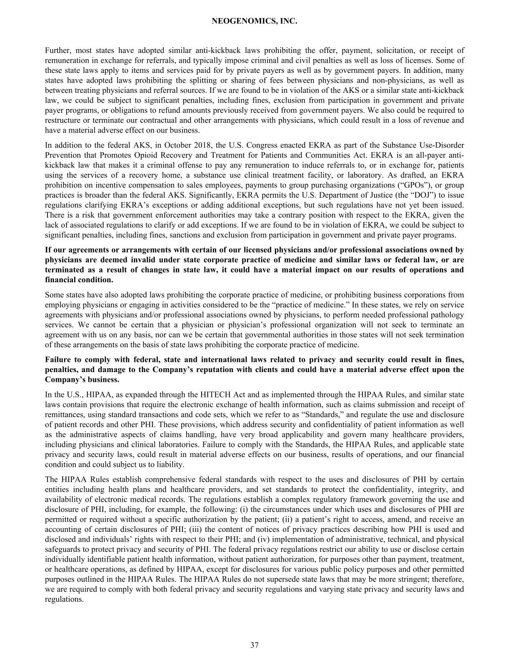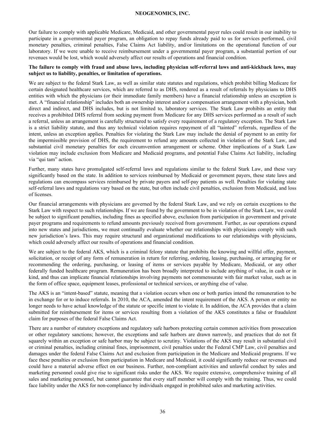regulations include the suspension, revocation, or limitation of the right to perform clinical laboratory services or receive compensation for those services, as well as the requirement to enter into a corrective action plan to monitor compliance, and the imposition of civil or criminal penalties or administrative fines. In addition, any new legislation or regulation or the application of existing laws and regulations in ways that we have not anticipated could have a material adverse effect on our business, results of operations, and financial condition. We are subject to licensing and regulation under federal, state, and local laws and regulations relating to the protection of the environment and human health and safety, including laws and regulations relating to the handling, transportation, and disposal of medical specimens, infectious and hazardous waste, and radioactive materials, as well as regulations relating to the safety and health of laboratory employees. The federal Occupational Safety and Health Administration has established extensive requirements relating to workplace safety for healthcare employers, including clinical laboratories, whose workers may be exposed to blood-borne pathogens such as HIV and the hepatitis B virus. These requirements, among other things, require work practice controls, protective clothing and equipment, training, medical follow-up, vaccinations, and other measures designed to minimize exposure to, and transmission of, blood-borne pathogens. In addition, the Needlestick Safety and Prevention Act requires, among other things, that we include in our safety programs the evaluation and use of engineering controls such as safety needles, if found to be effective at reducing the risk of needlestick injuries in the workplace. Failure to comply with such federal, state and local laws and regulations could subject us to denial of the right to conduct business, fines, criminal penalties and/or other enforcement actions, any of which could have a material adverse effect on our business. In addition, compliance with future legislation could impose additional requirements for us, which may be costly. We may also be subject to laboratory regulations in foreign jurisdictions, including in the United Kingdom, and as we seek to expand our Advanced Diagnostics business into Europe, or as such jurisdictions adopt new licensure requirements, which may require review of our tests in order to offer them or may have other limitations such as restrictions on the transport of specimens necessary for us to perform our tests that may limit our ability to make our tests available outside of the U.S. Complying with licensure requirements in new jurisdictions may be expensive, time-consuming and subject us to significant and unanticipated delays. Our net revenue will be diminished if payers do not adequately cover or reimburse our services. There has been, and will continue to be, significant efforts by both federal and state agencies to reduce costs in government healthcare programs and otherwise implement government control of healthcare costs. In addition, private payers continually seek ways to reduce and control overall healthcare costs, and increasing emphasis on managed care in the United States will continue to put pressure on the pricing of healthcare services. Uncertainty exists as to the coverage and reimbursement status of new applications and services. Third-party payers, including governmental payers such as Medicare and private payers, are scrutinizing new medical products and services and may not cover or may limit coverage and the level of reimbursement for our services, or may impose processes, such as requirements for prior authorization, that can challenge coverage and reimbursement. Third-party insurance coverage may not be available to patients for any of our existing tests or for tests we discover and develop, and a substantial portion of the testing for which we bill our hospital and laboratory clients is ultimately paid by third-party payers. Likewise, any pricing pressure exerted by these third-party payers on our clients may, in turn, be exerted by our clients on us. If government and other third-party payers do not provide adequate coverage and reimbursement for our tests, it could adversely affect our operating results, cash flows and/or our financial condition. Our operations are subject to strict laws prohibiting fraudulent billing and other abuse, and our failure to comply with such laws could result in substantial penalties, including exclusion from participation in Medicare, Medicaid, and other governmental payer programs. We are subject to extensive federal, state and local laws and regulations in the U.S., including the following laws related to fraud and abuse: • the federal Anti-Kickback Statute (AKS), which prohibits knowingly and willfully offering, paying, soliciting, or receiving remuneration, directly or indirectly, in exchange for or to induce either the referral of an individual, or the furnishing, arranging for, or recommending of an item or service that is reimbursable, in whole or in part, by a federal health care program; • the Eliminating Kickbacks in Recovery Act of 2018 (EKRA), which is an all-payer anti-kickback prohibition on, among other things, knowingly and willfully paying or offering any remuneration directly or indirectly to induce a referral of an individual to a clinical laboratory; • the federal physician self-referral prohibition (Stark Law or the Physician Self-Referral Law), which, absent an exception, prohibits a physician from making a Medicare referral for certain designated health services, including NEOGENOMICS, INC. 33