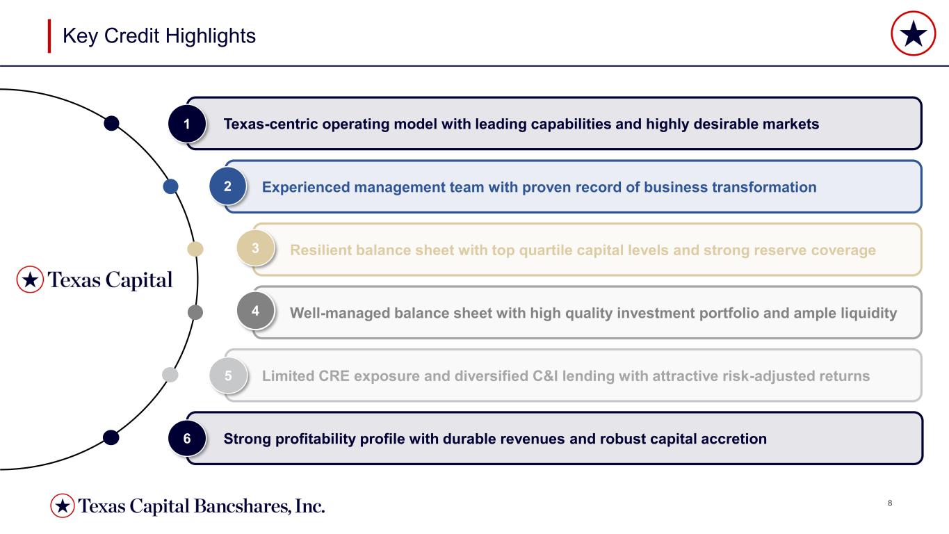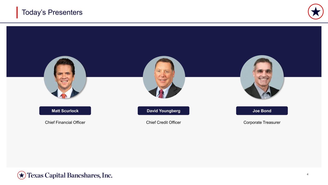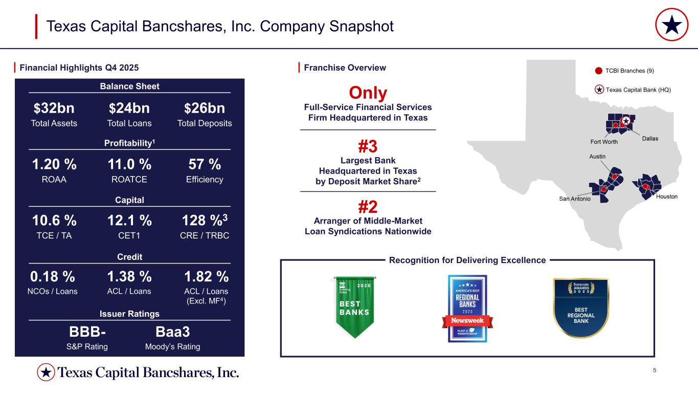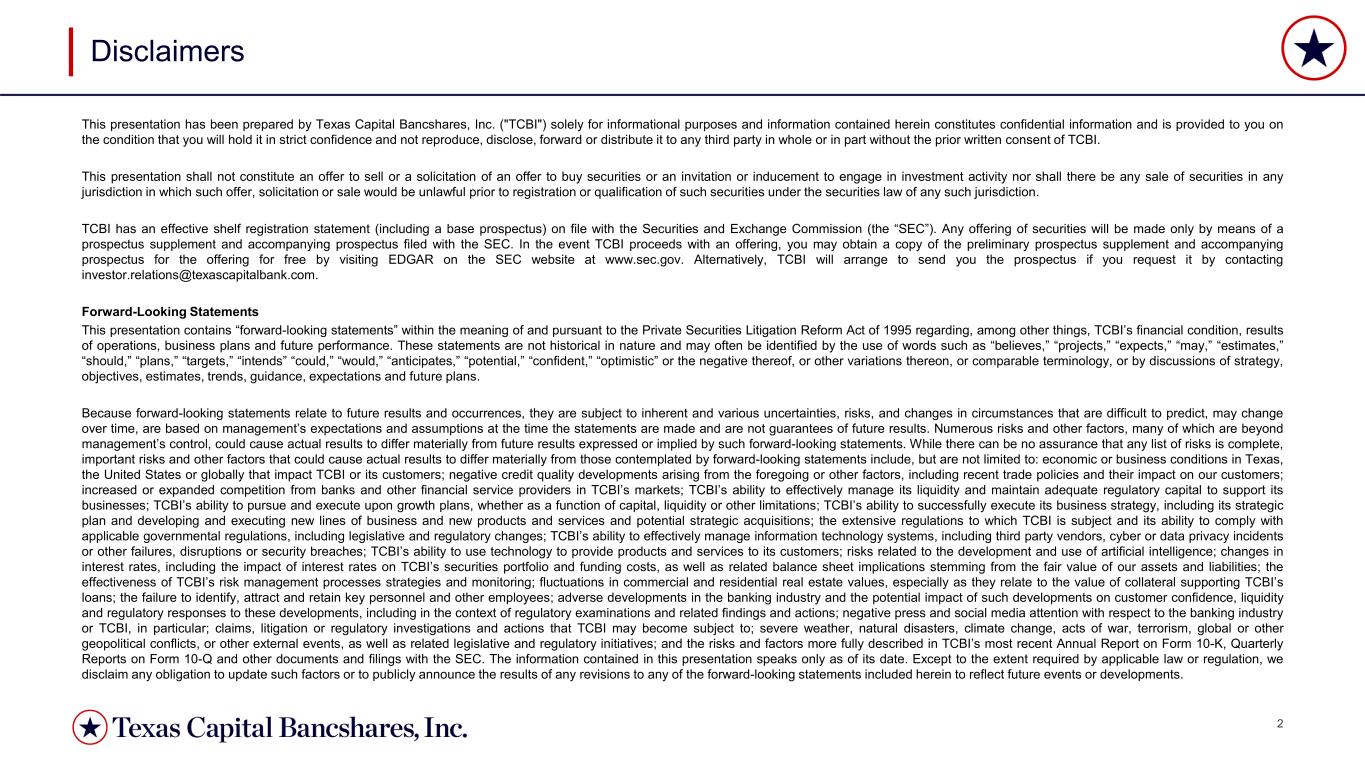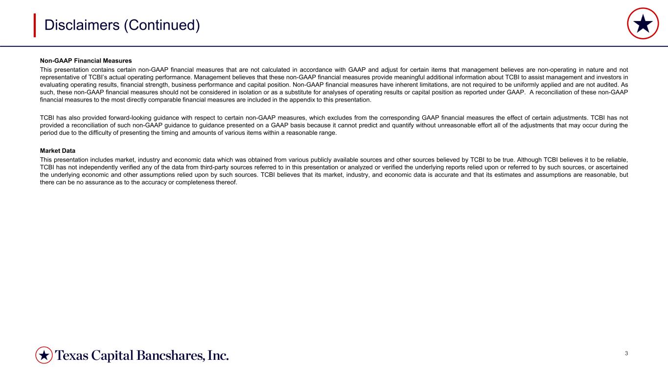 2 Disclaimers This presentation has been prepared by Texas Capital Bancshares, Inc. ("TCBI") solely for informational purposes and information contained herein constitutes confidential information and is provided to you on the condition that you will hold it in strict confidence and not reproduce, disclose, forward or distribute it to any third party in whole or in part without the prior written consent of TCBI. This presentation shall not constitute an offer to sell or a solicitation of an offer to buy securities or an invitation or inducement to engage in investment activity nor shall there be any sale of securities in any jurisdiction in which such offer, solicitation or sale would be unlawful prior to registration or qualification of such securities under the securities law of any such jurisdiction. TCBI has an effective shelf registration statement (including a base prospectus) on file with the Securities and Exchange Commission (the “SEC”). Any offering of securities will be made only by means of a prospectus supplement and accompanying prospectus filed with the SEC. In the event TCBI proceeds with an offering, you may obtain a copy of the preliminary prospectus supplement and accompanying prospectus for the offering for free by visiting EDGAR on the SEC website at www.sec.gov. Alternatively, TCBI will arrange to send you the prospectus if you request it by contacting investor.relations@texascapitalbank.com. Forward-Looking Statements This presentation contains “forward-looking statements” within the meaning of and pursuant to the Private Securities Litigation Reform Act of 1995 regarding, among other things, TCBI’s financial condition, results of operations, business plans and future performance. These statements are not historical in nature and may often be identified by the use of words such as “believes,” “projects,” “expects,” “may,” “estimates,” “should,” “plans,” “targets,” “intends” “could,” “would,” “anticipates,” “potential,” “confident,” “optimistic” or the negative thereof, or other variations thereon, or comparable terminology, or by discussions of strategy, objectives, estimates, trends, guidance, expectations and future plans. Because forward-looking statements relate to future results and occurrences, they are subject to inherent and various uncertainties, risks, and changes in circumstances that are difficult to predict, may change over time, are based on management’s expectations and assumptions at the time the statements are made and are not guarantees of future results. Numerous risks and other factors, many of which are beyond management’s control, could cause actual results to differ materially from future results expressed or implied by such forward-looking statements. While there can be no assurance that any list of risks is complete, important risks and other factors that could cause actual results to differ materially from those contemplated by forward-looking statements include, but are not limited to: economic or business conditions in Texas, the United States or globally that impact TCBI or its customers; negative credit quality developments arising from the foregoing or other factors, including recent trade policies and their impact on our customers; increased or expanded competition from banks and other financial service providers in TCBI’s markets; TCBI’s ability to effectively manage its liquidity and maintain adequate regulatory capital to support its businesses; TCBI’s ability to pursue and execute upon growth plans, whether as a function of capital, liquidity or other limitations; TCBI’s ability to successfully execute its business strategy, including its strategic plan and developing and executing new lines of business and new products and services and potential strategic acquisitions; the extensive regulations to which TCBI is subject and its ability to comply with applicable governmental regulations, including legislative and regulatory changes; TCBI’s ability to effectively manage information technology systems, including third party vendors, cyber or data privacy incidents or other failures, disruptions or security breaches; TCBI’s ability to use technology to provide products and services to its customers; risks related to the development and use of artificial intelligence; changes in interest rates, including the impact of interest rates on TCBI’s securities portfolio and funding costs, as well as related balance sheet implications stemming from the fair value of our assets and liabilities; the effectiveness of TCBI’s risk management processes strategies and monitoring; fluctuations in commercial and residential real estate values, especially as they relate to the value of collateral supporting TCBI’s loans; the failure to identify, attract and retain key personnel and other employees; adverse developments in the banking industry and the potential impact of such developments on customer confidence, liquidity and regulatory responses to these developments, including in the context of regulatory examinations and related findings and actions; negative press and social media attention with respect to the banking industry or TCBI, in particular; claims, litigation or regulatory investigations and actions that TCBI may become subject to; severe weather, natural disasters, climate change, acts of war, terrorism, global or other geopolitical conflicts, or other external events, as well as related legislative and regulatory initiatives; and the risks and factors more fully described in TCBI’s most recent Annual Report on Form 10-K, Quarterly Reports on Form 10-Q and other documents and filings with the SEC. The information contained in this presentation speaks only as of its date. Except to the extent required by applicable law or regulation, we disclaim any obligation to update such factors or to publicly announce the results of any revisions to any of th
