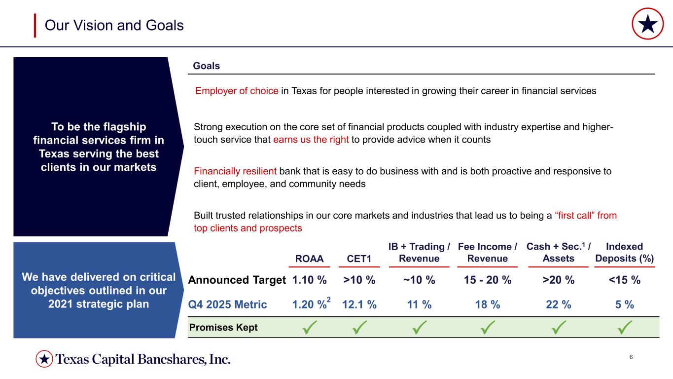 5 Texas Capital Bancshares, Inc. Company Snapshot Financial Highlights Q4 2025 Franchise Overview $32bn Total Assets BBB- S&P Rating Baa3 Moody’s Rating 1.20 % ROAA 10.6 % TCE / TA #3 Largest Bank Headquartered in Texas by Deposit Market Share2 #2 Arranger of Middle-Market Loan Syndications Nationwide $24bn Total Loans 11.0 % ROATCE 12.1 % CET1 $26bn Total Deposits 57 % Efficiency 128 %3 CRE / TRBC 0.18 % NCOs / Loans 1.82 % ACL / Loans (Excl. MF4) Texas Capital Bank (HQ) TCBI Branches (9) Footnotes for the slide Source: SNL 1. By Texas deposits. Balance Sheet Profitability1 Capital Credit Issuer Ratings Recognition for Delivering Excellence Only Full-Service Financial Services Firm Headquartered in Texas 1.38 % ACL / Loans