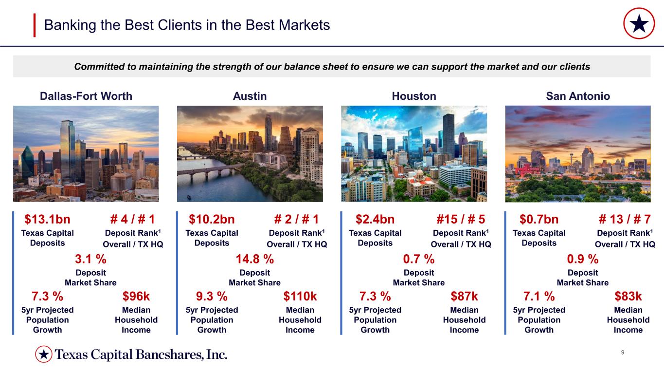 8 Key Credit Highlights Experienced management team with proven record of business transformation2 Texas-centric operating model with leading capabilities and highly desirable markets1 Limited CRE exposure and diversified C&I lending with attractive risk-adjusted returns5 Resilient balance sheet with top quartile capital levels and strong reserve coverage3 Well-managed balance sheet with high quality investment portfolio and ample liquidity4 Strong profitability profile with durable revenues and robust capital accretion 6