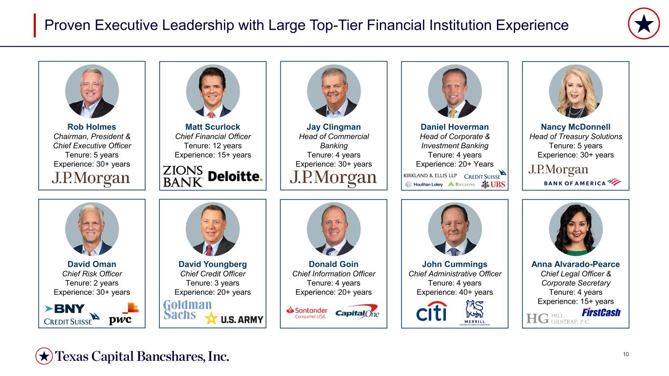 9 Banking the Best Clients in the Best Markets Dallas-Fort Worth San Antonio San Antonio picture $13.1bn Texas Capital Deposits # 4 / # 1 Deposit Rank1 Overall / TX HQ 3.1 % Deposit Market Share 7.3 % 5yr Projected Population Growth $96k Median Household Income $0.7bn Texas Capital Deposits # 13 / # 7 Deposit Rank1 Overall / TX HQ 0.9 % Deposit Market Share 7.1 % 5yr Projected Population Growth $83k Median Household Income Austin $10.2bn Texas Capital Deposits # 2 / # 1 Deposit Rank1 Overall / TX HQ 14.8 % Deposit Market Share 9.3 % 5yr Projected Population Growth $110k Median Household Income Footnotes for slide Source: S&P Global. Note: Market ranks exclude brokerages. Houston $2.4bn Texas Capital Deposits #15 / # 5 Deposit Rank1 Overall / TX HQ 0.7 % Deposit Market Share 7.3 % 5yr Projected Population Growth $87k Median Household Income Committed to maintaining the strength of our balance sheet to ensure we can support the market and our clients
